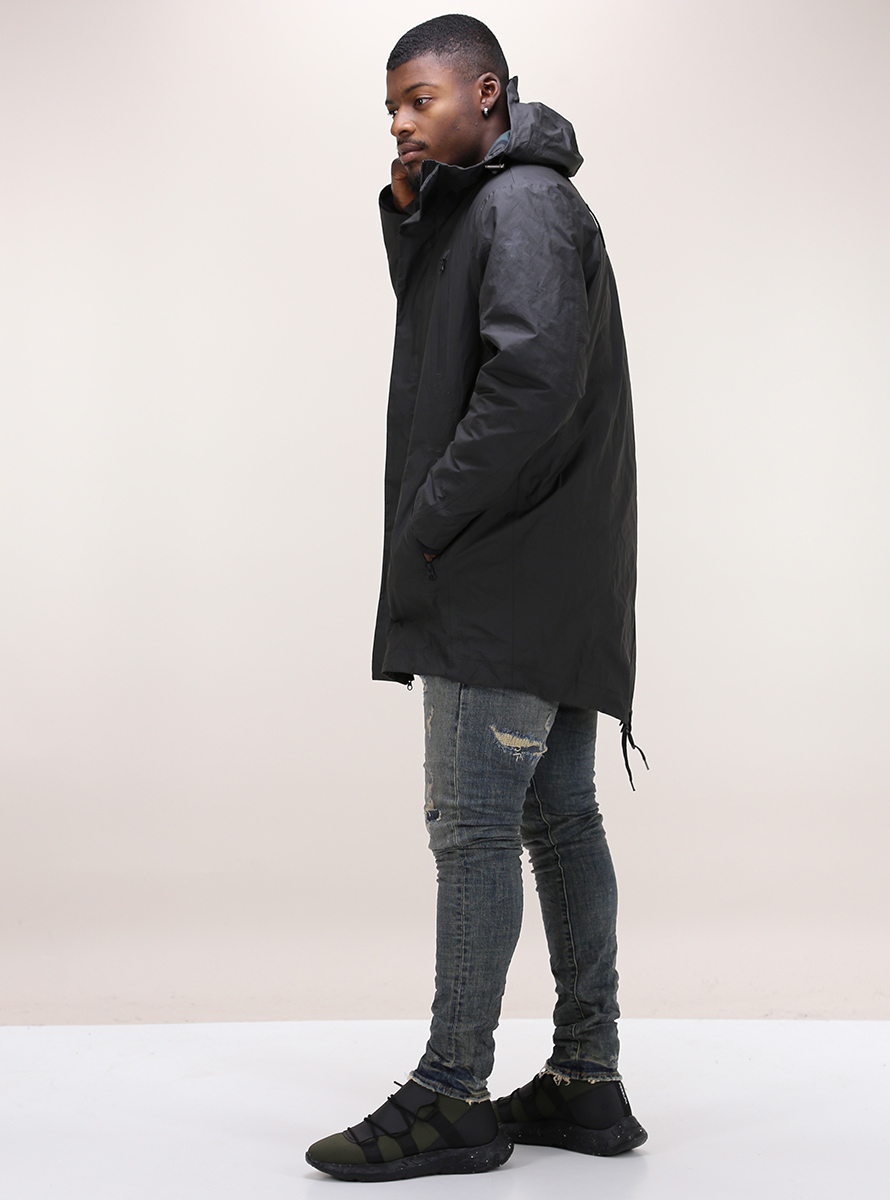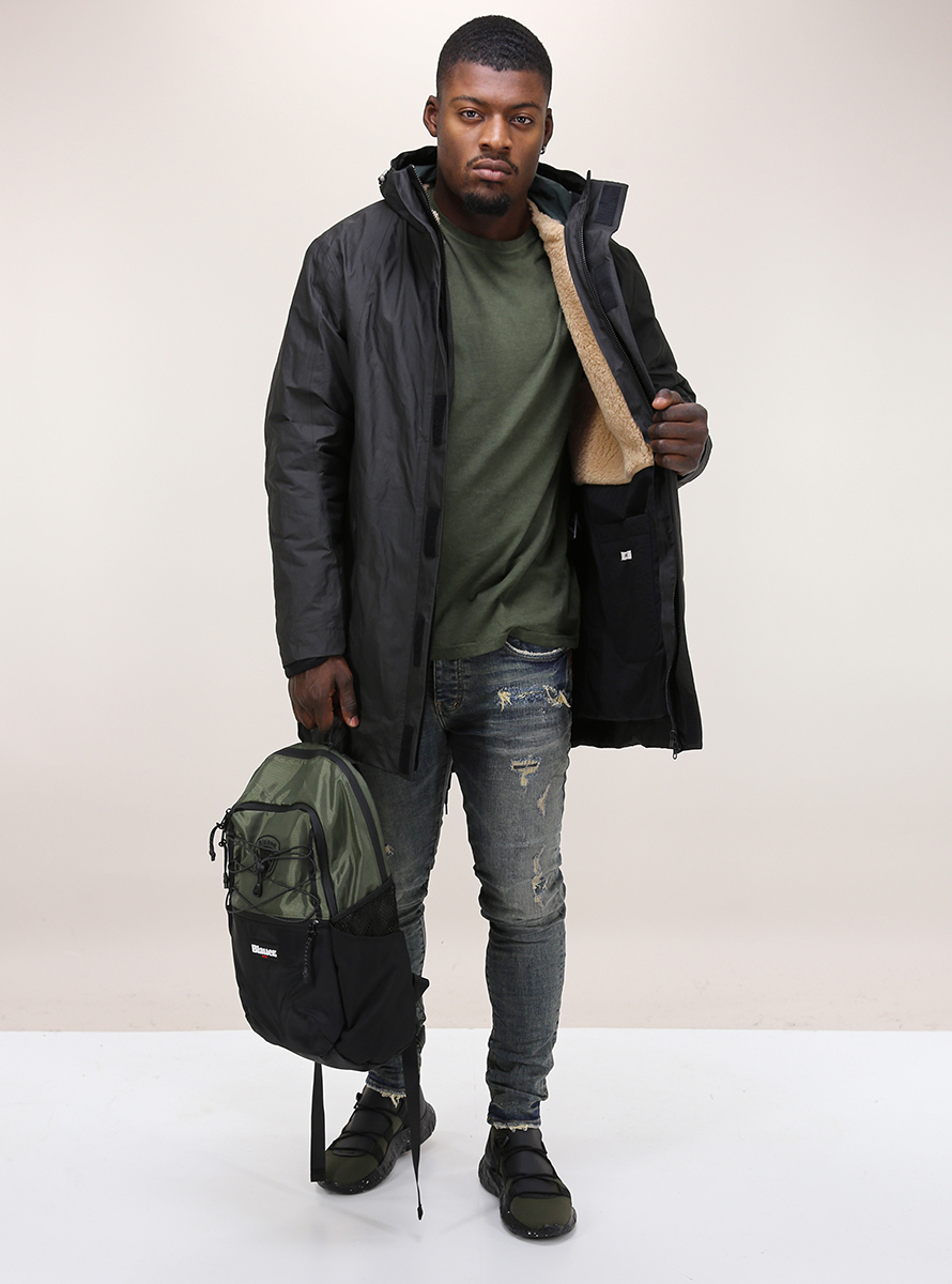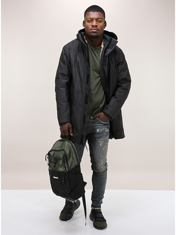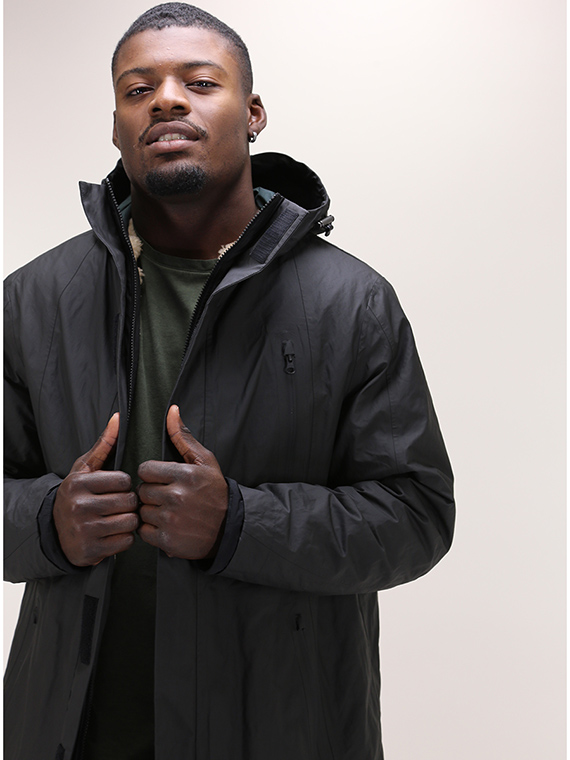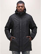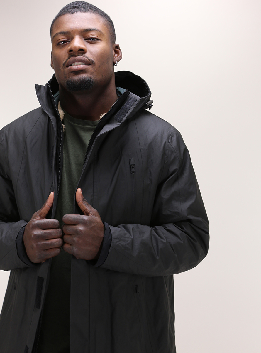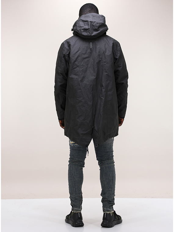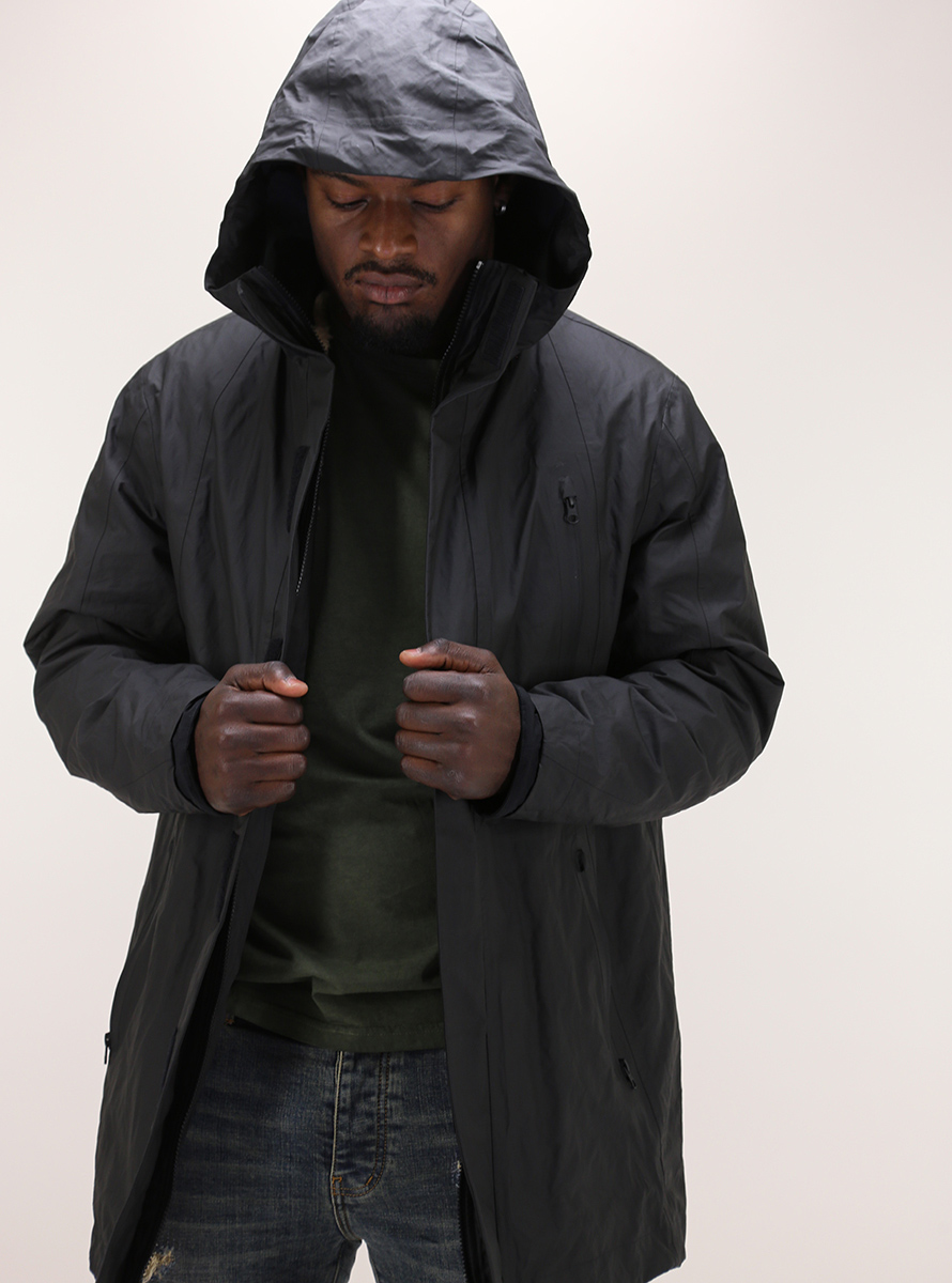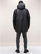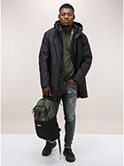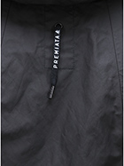 Premiata Prmt parka in coated cotton blend with detachable ecofur lining. Long sleeves and hooded collar with drawstring. Heat-sealed pockets and front double-slider zip closure with Velcro. Logo detail on the back. The model is 1.80 tall and wears size 50.