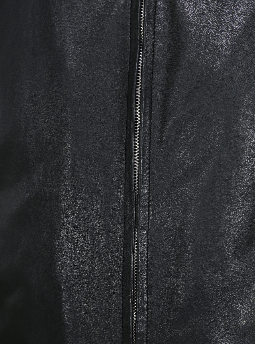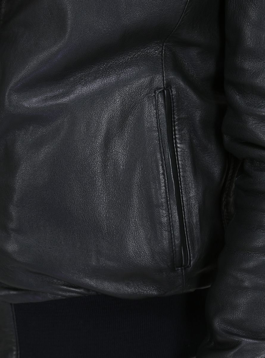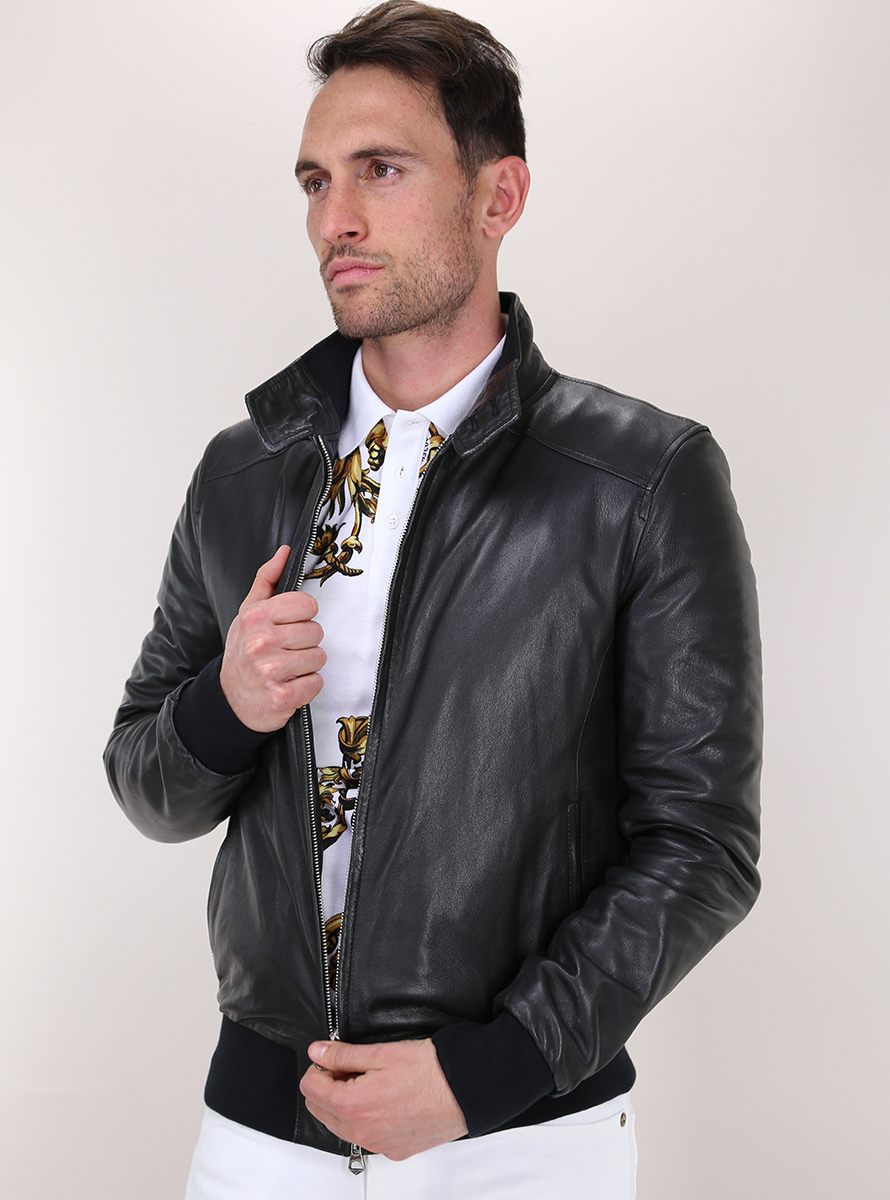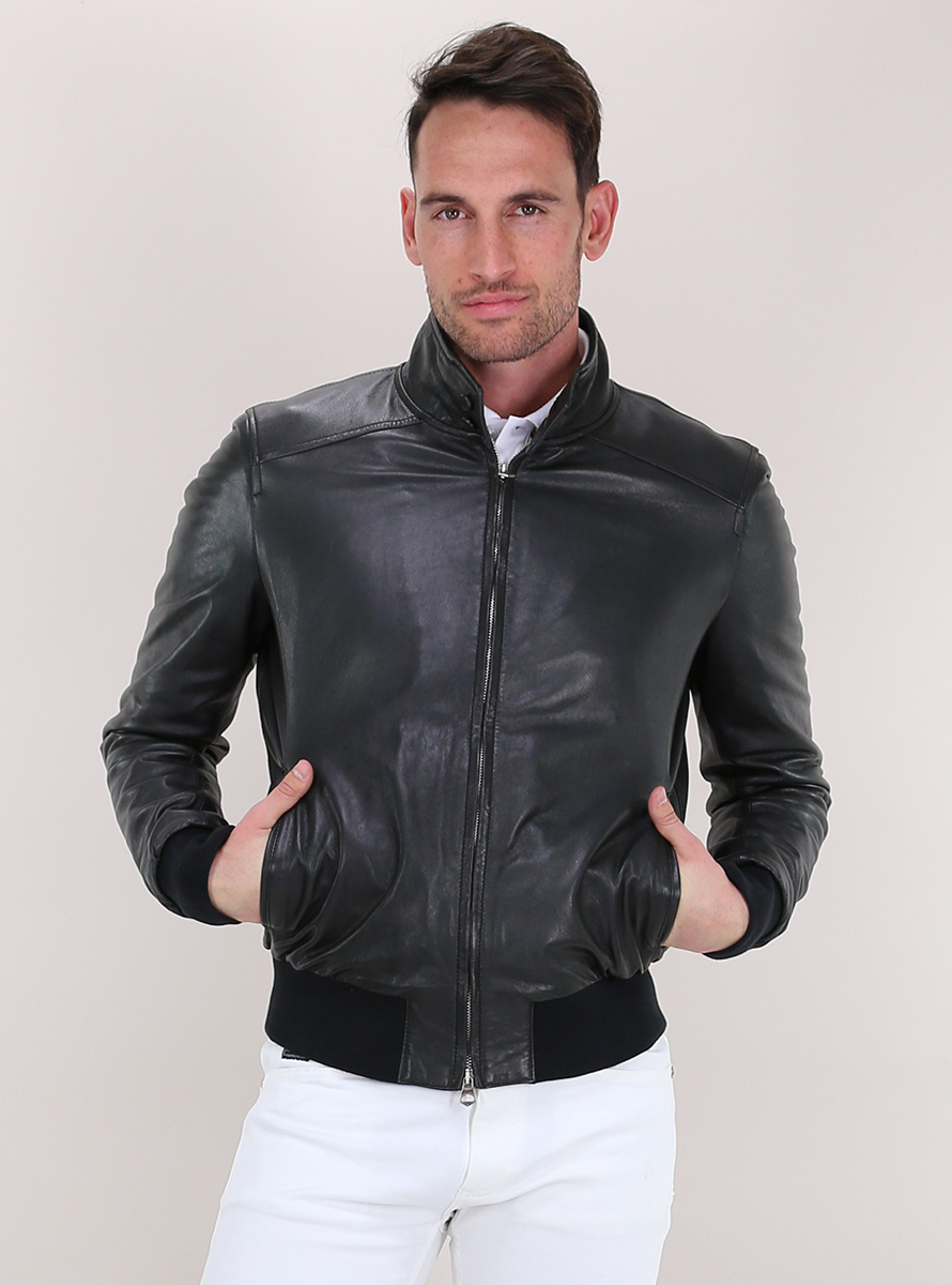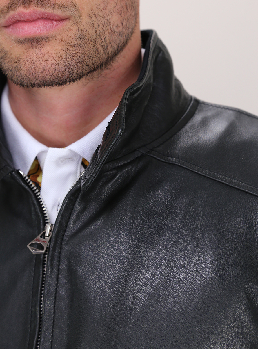 Stewart padded leather jacket with long sleeves and buttoned band collar. Double-slider front zip closure and side welt pockets. Cuff edges and bottom. The model is 1.80 tall and wears size M.