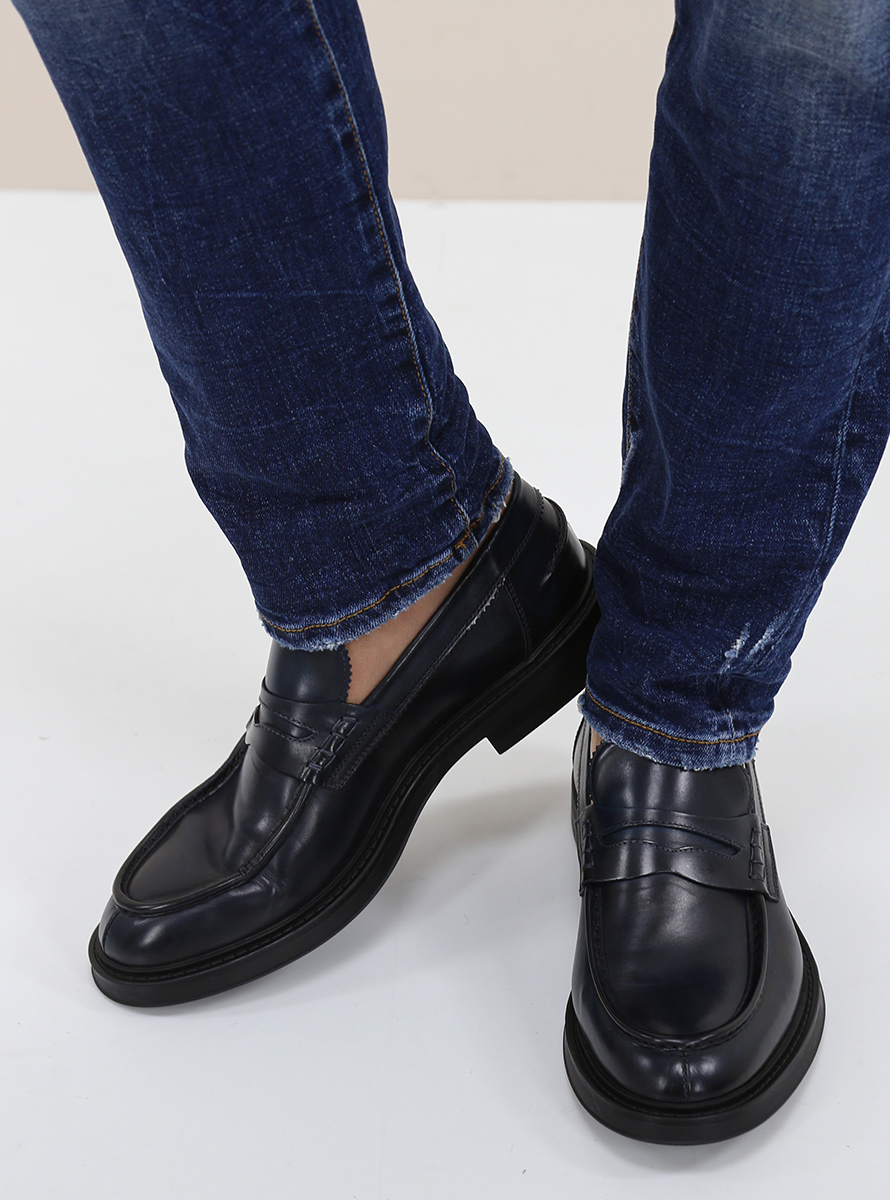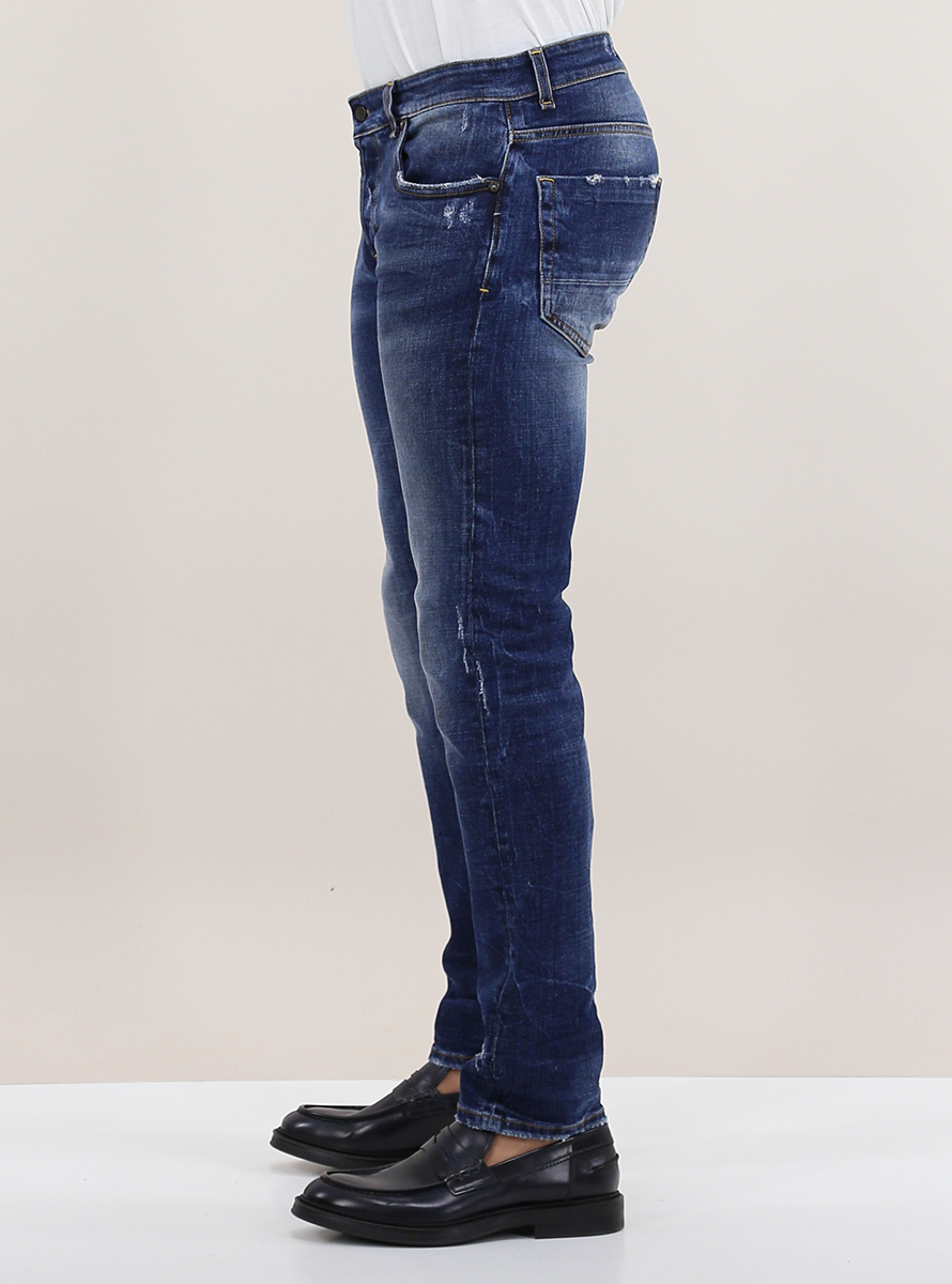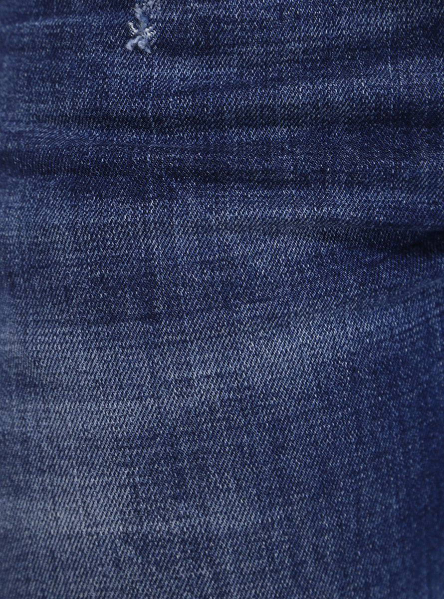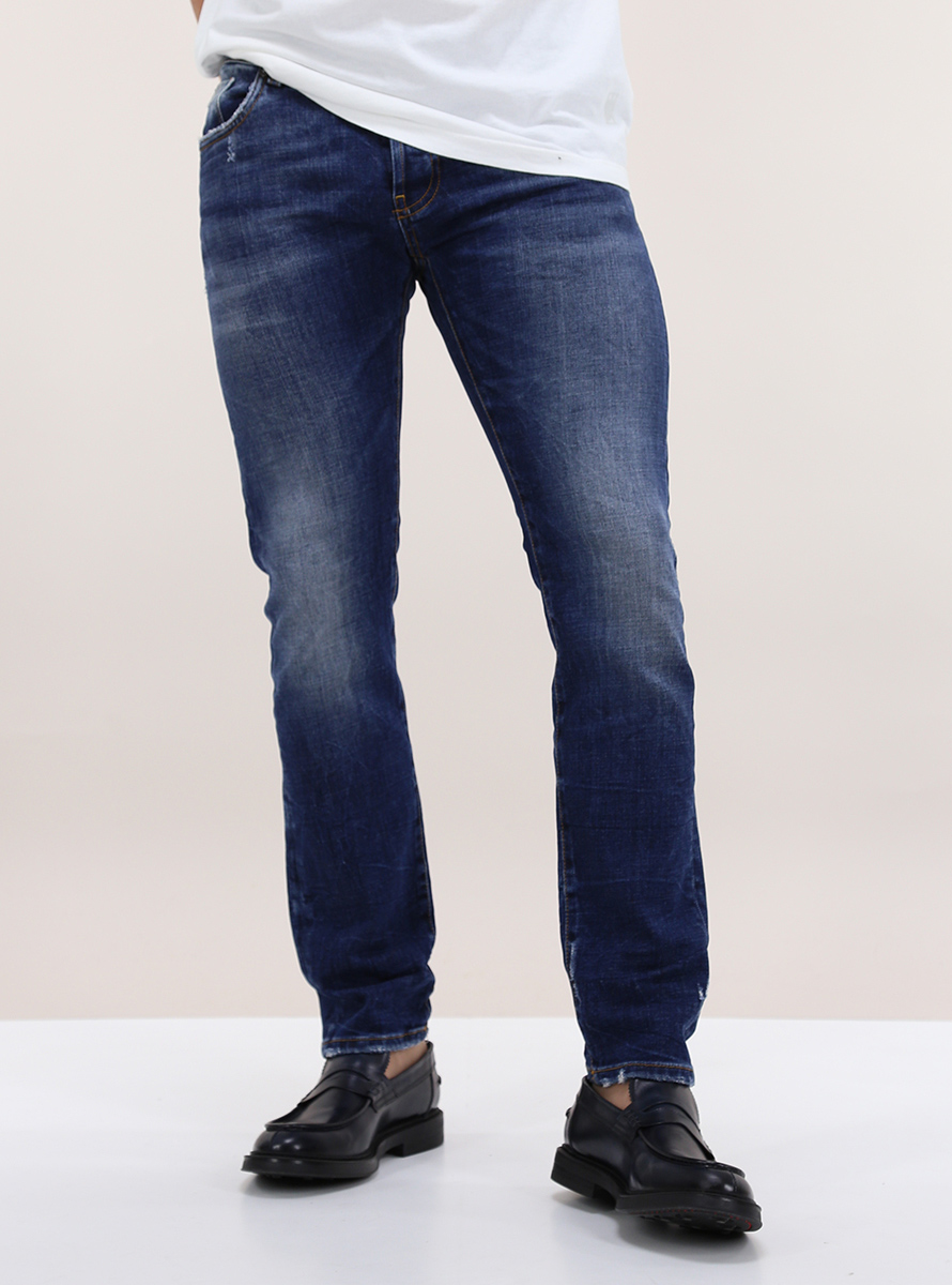 Messagerie jeans in stretch cotton denim. Slim fit. Front and back abrasions and washed effect with shades. Front closure buttons. The model is 1.75 tall and wears size 32.