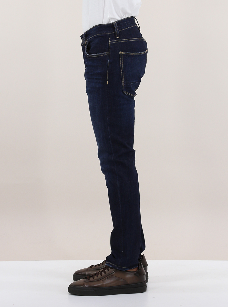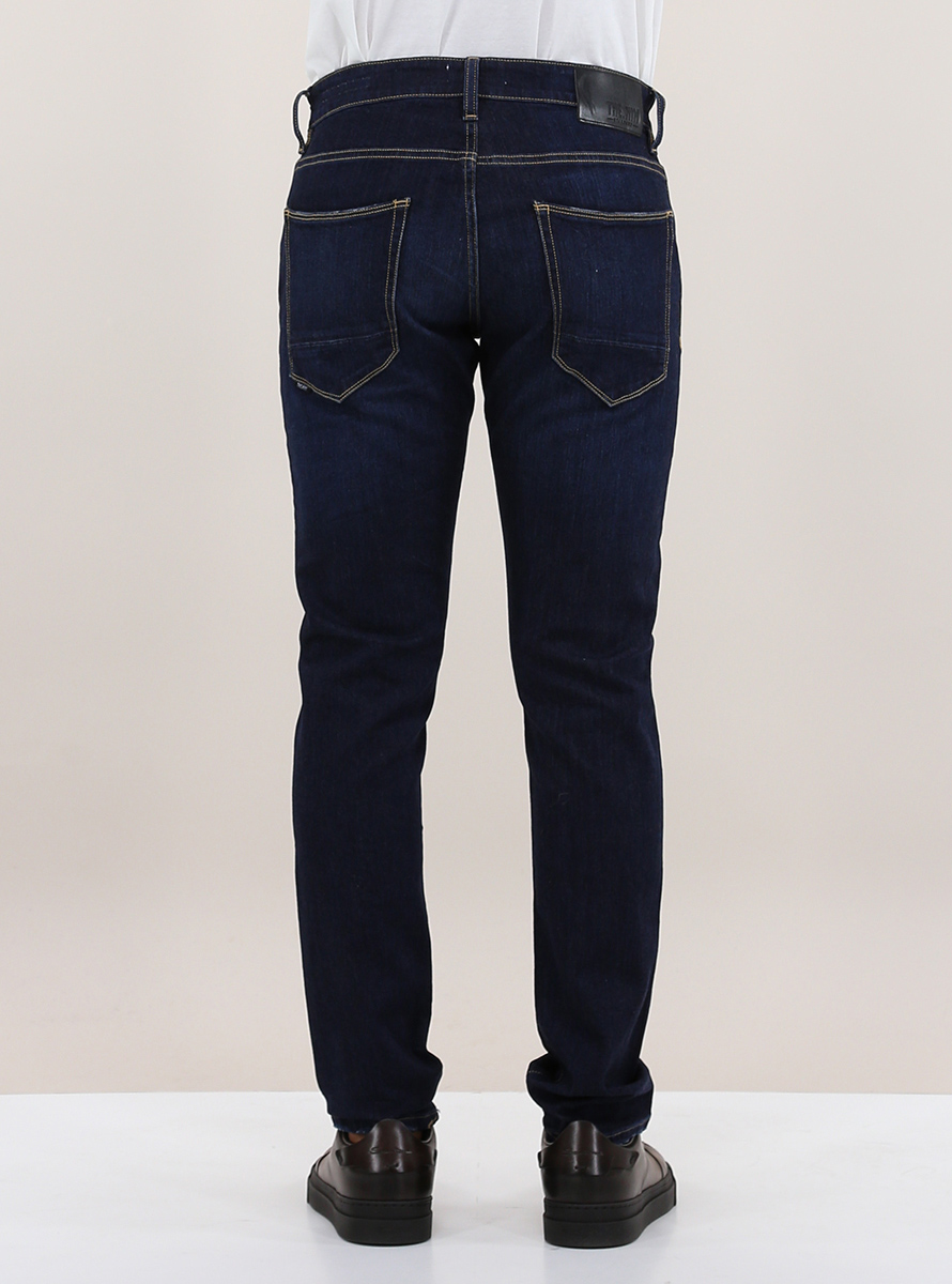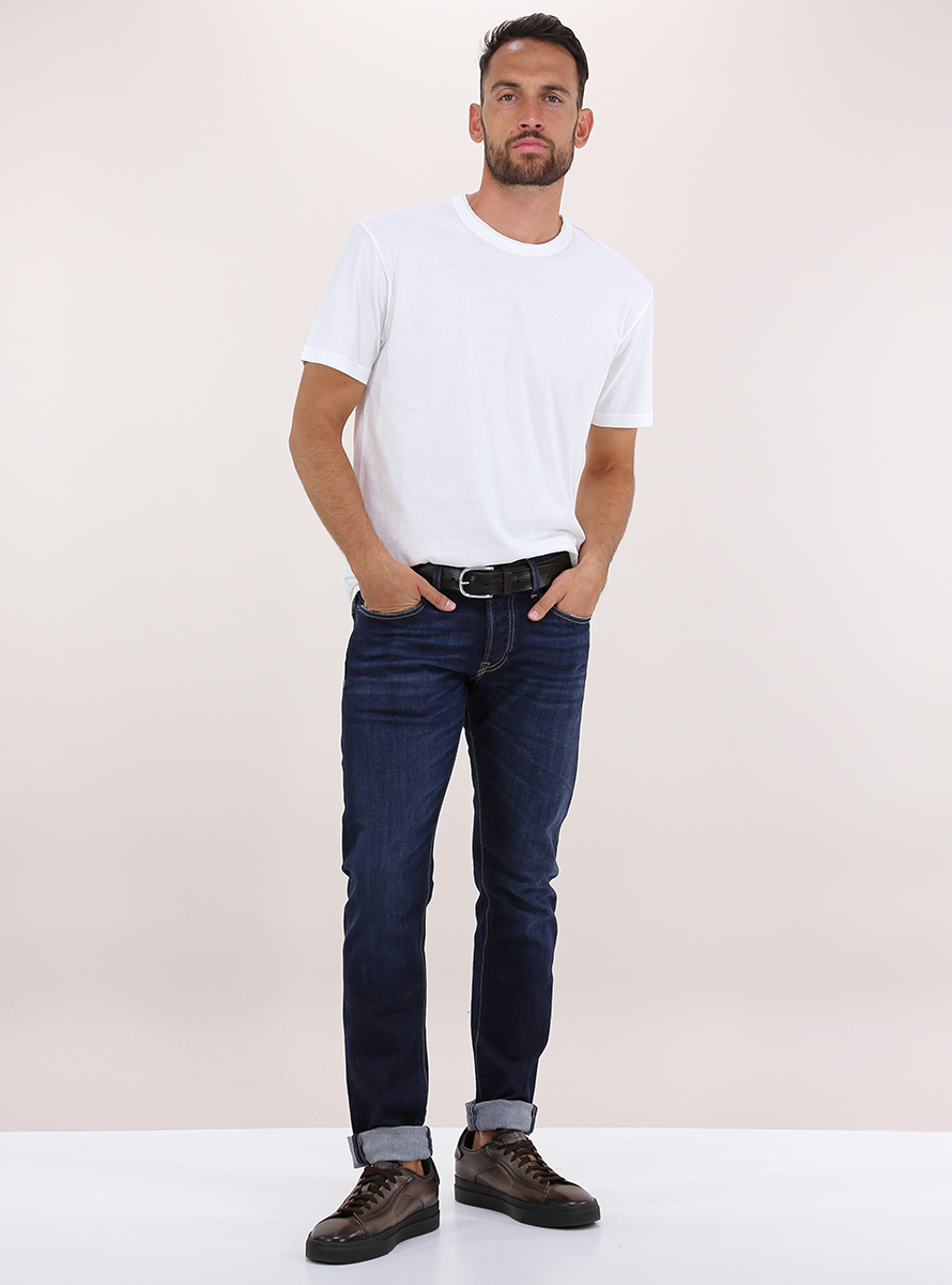 The Nim jeans in stretch cotton denim. Contrast stitching. Flamed wash. Slim fit. The model is 1.80 tall and wears size 32.