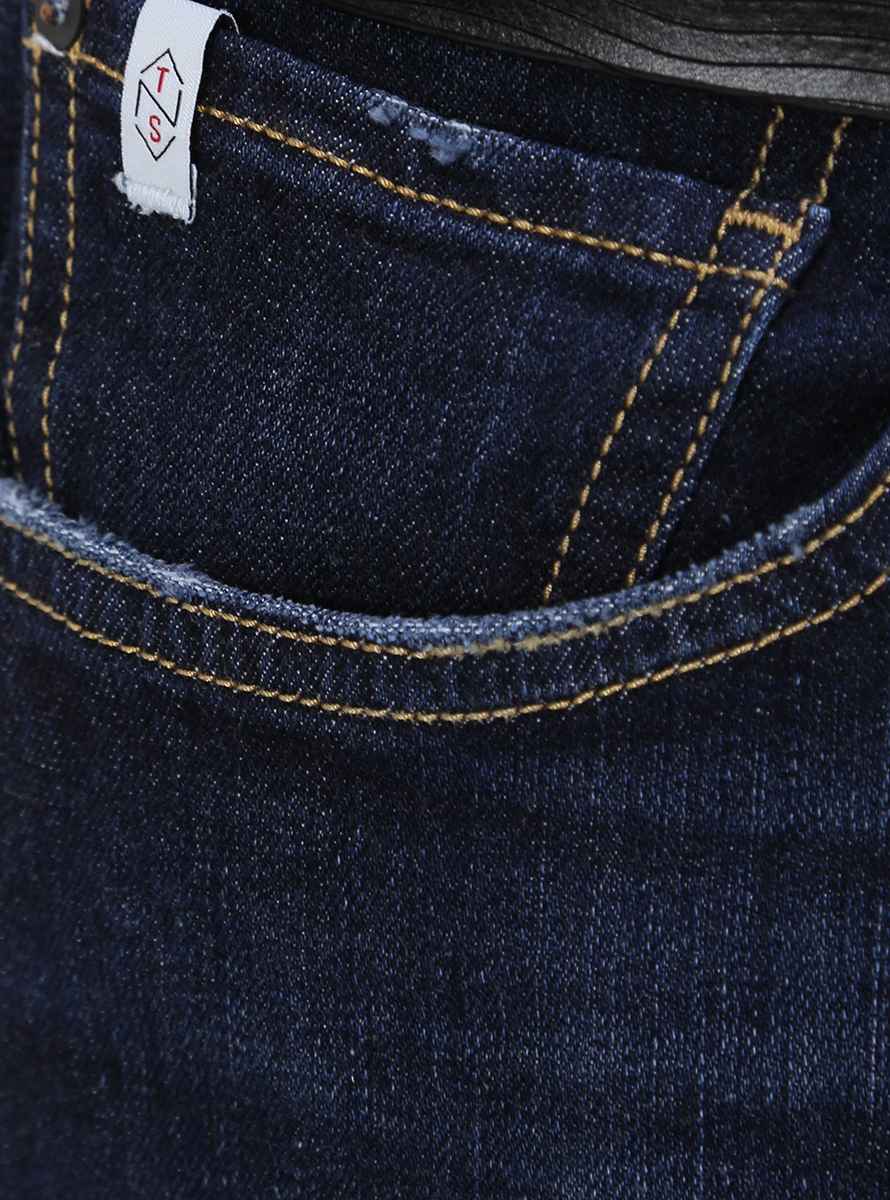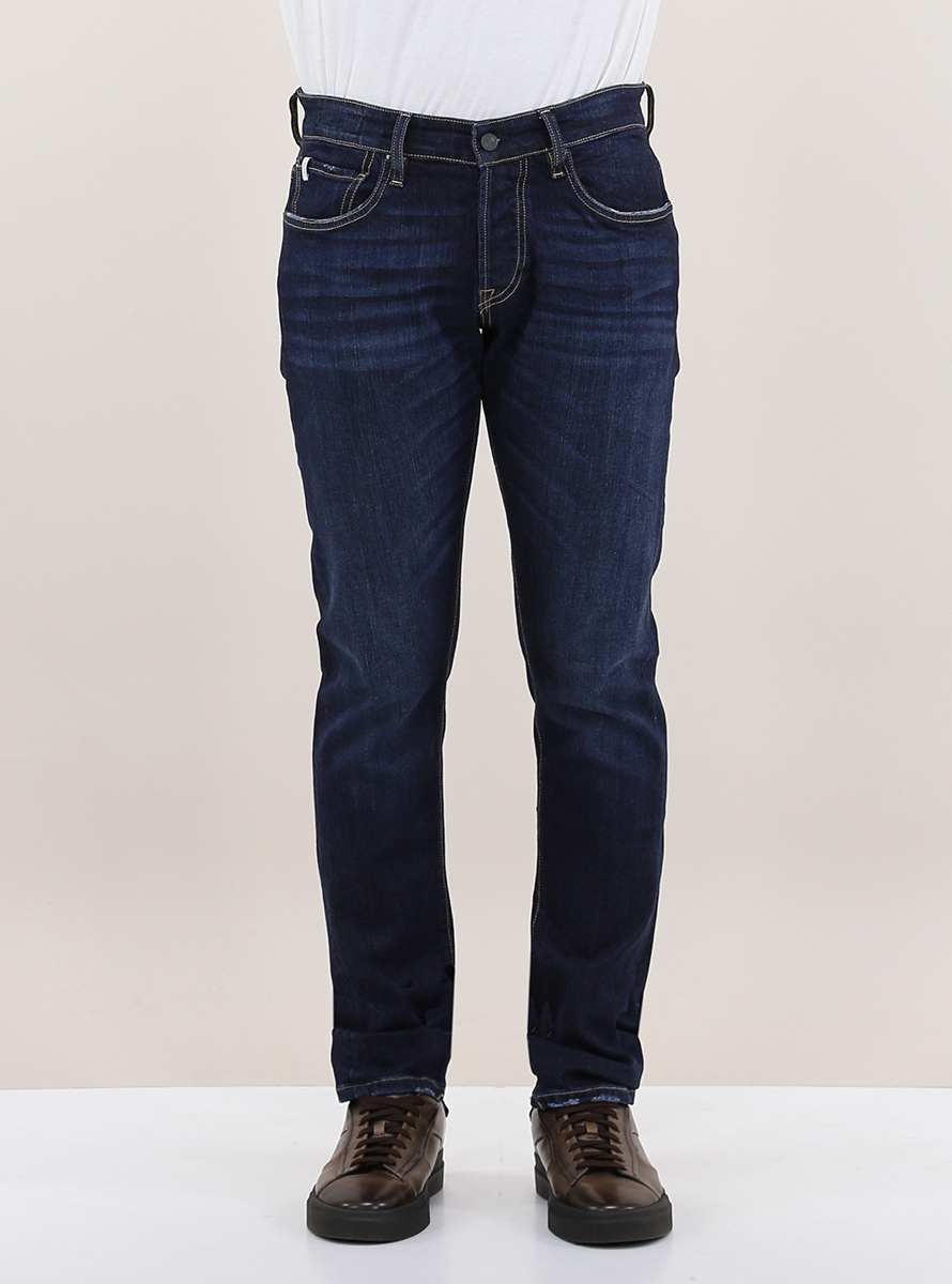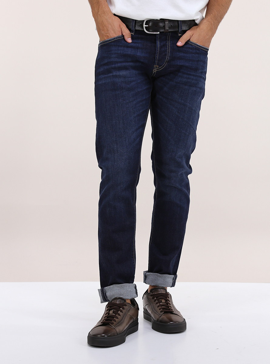 The Nim jeans in stretch cotton denim. Contrast stitching. Flamed wash. Slim fit. The model is 1.80 tall and wears size 32.