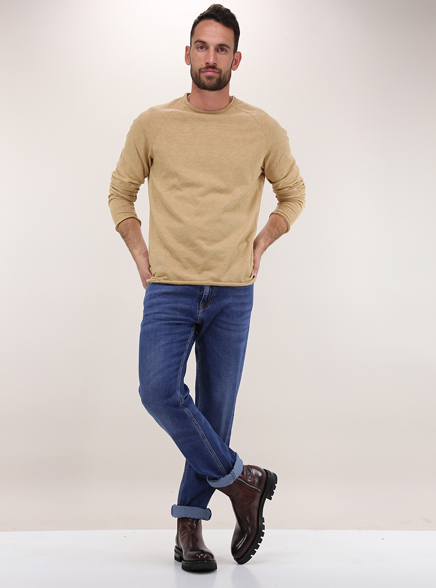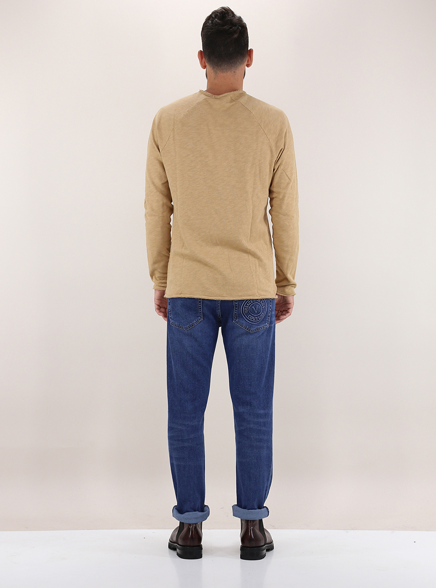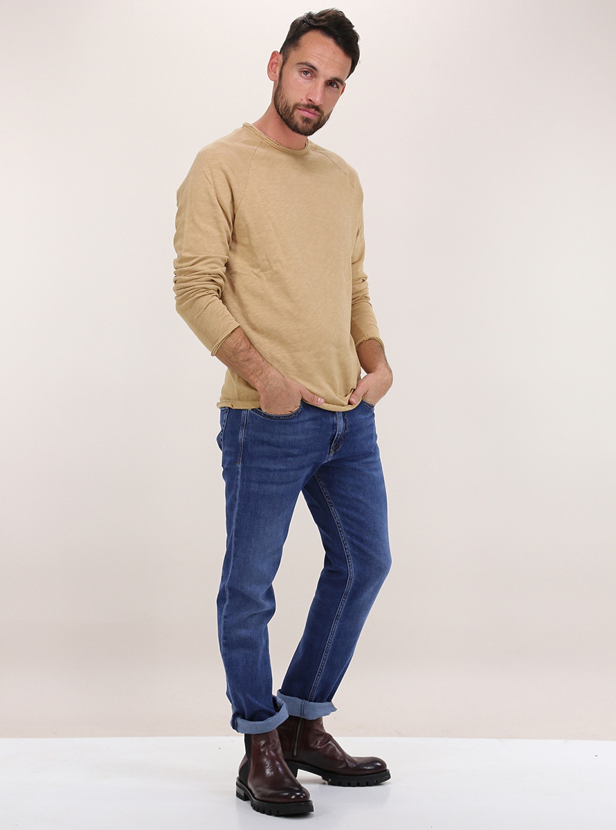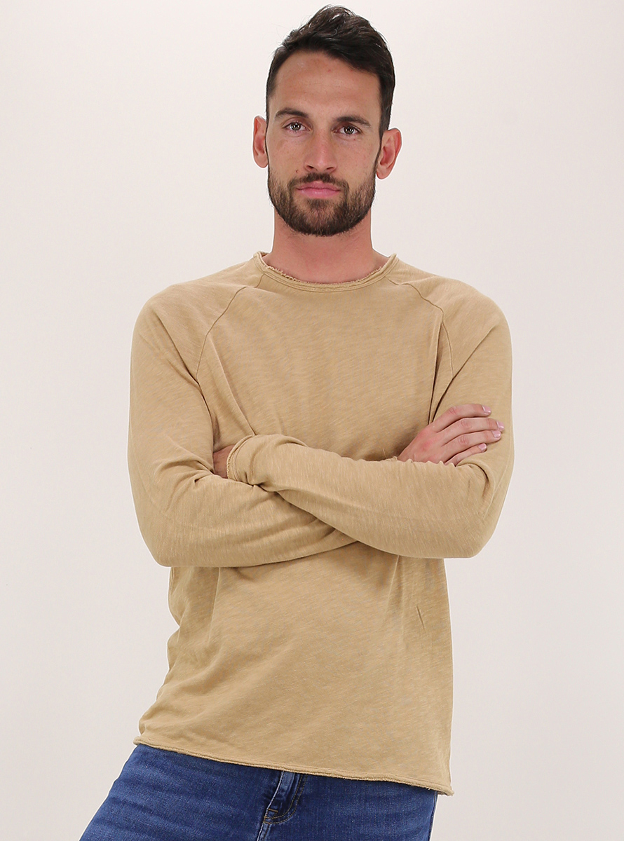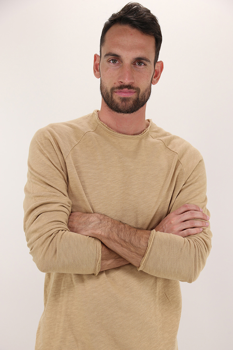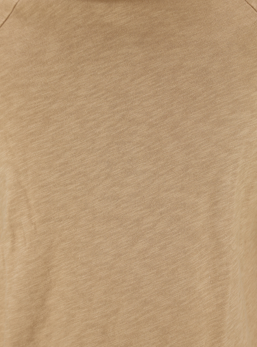 American Vintage t-shirt in slub cotton. Long raglan sleeves and round neck. Raw cut edges. The model is 1.80 tall and wears size M.