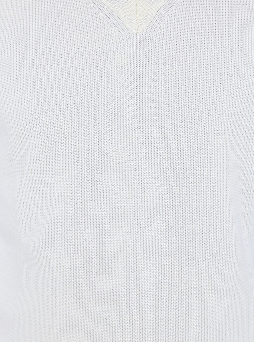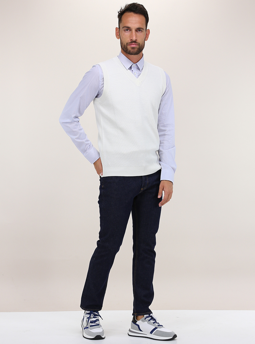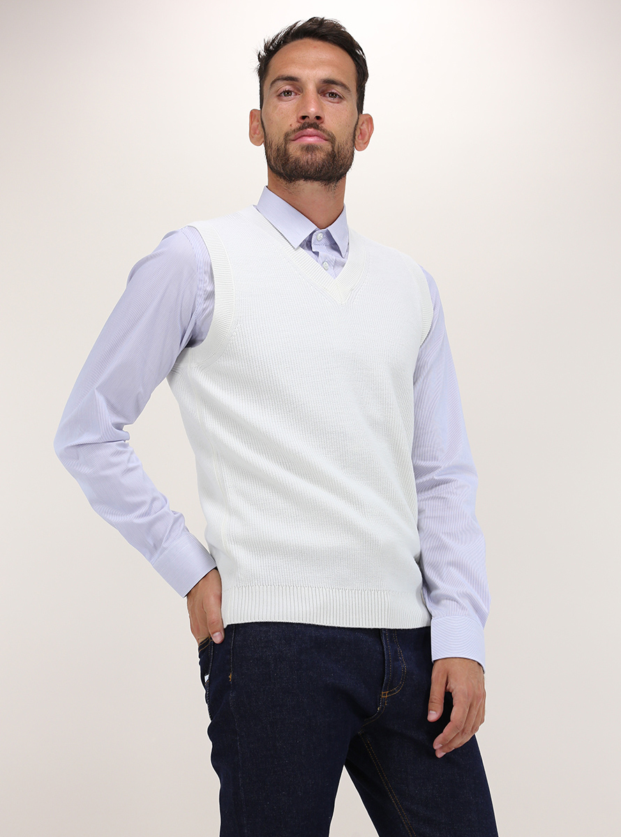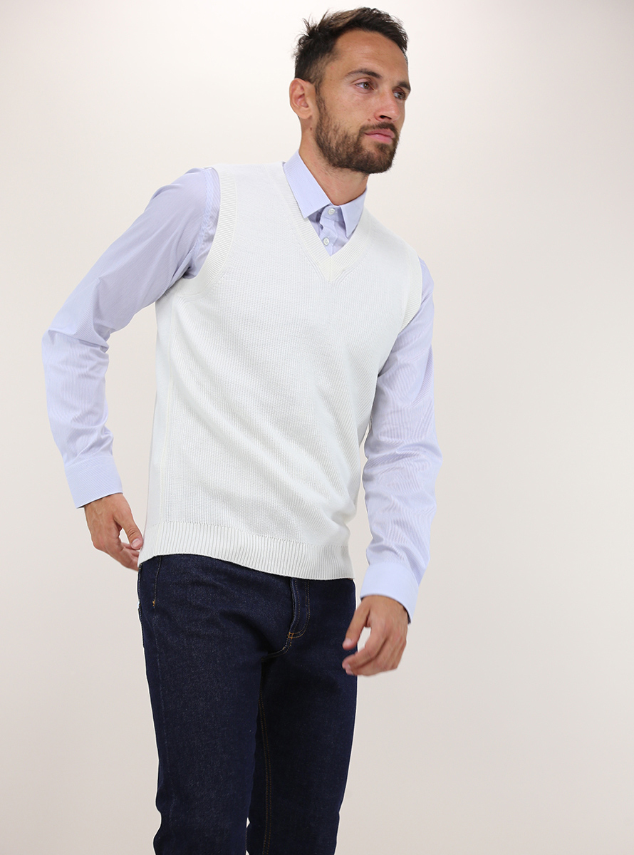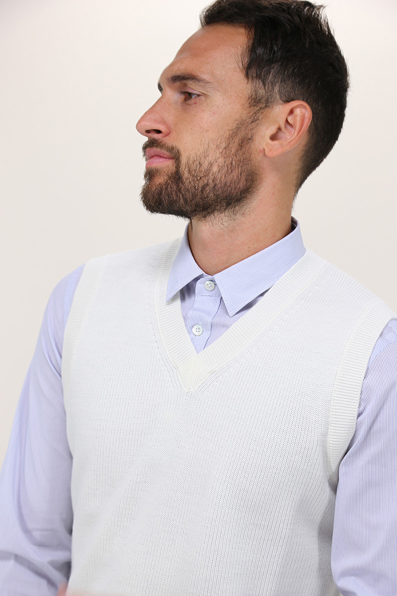 Jeordie's vest in non-shrink extrafine pure merino wool. V-neck and cuffed edges. The model is 1.80 tall and wears size M.