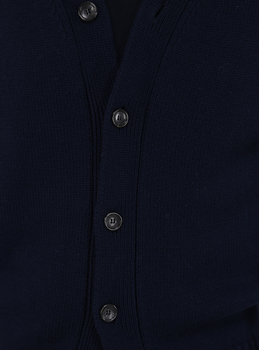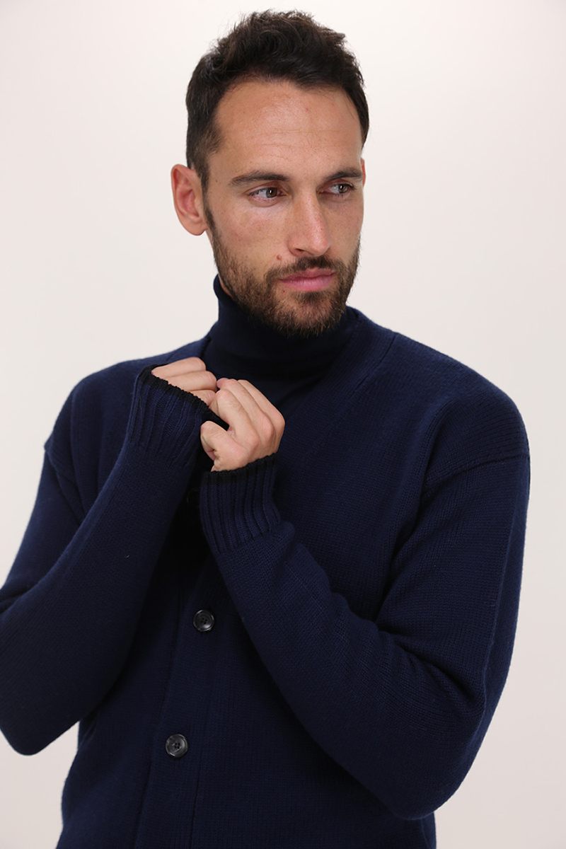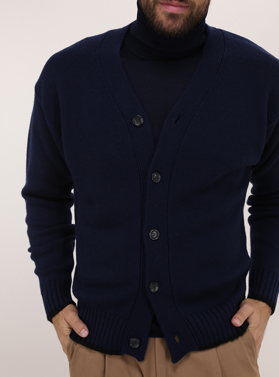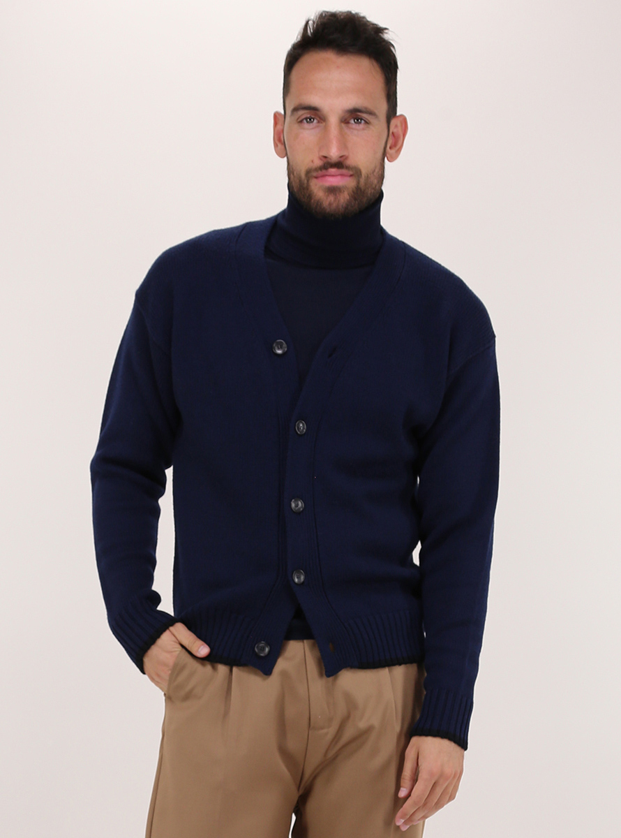 Lowbrand cardigan in merino wool with long sleeves. Regular fit. Contrasting edges. The model is 1.80 tall and wears size II.