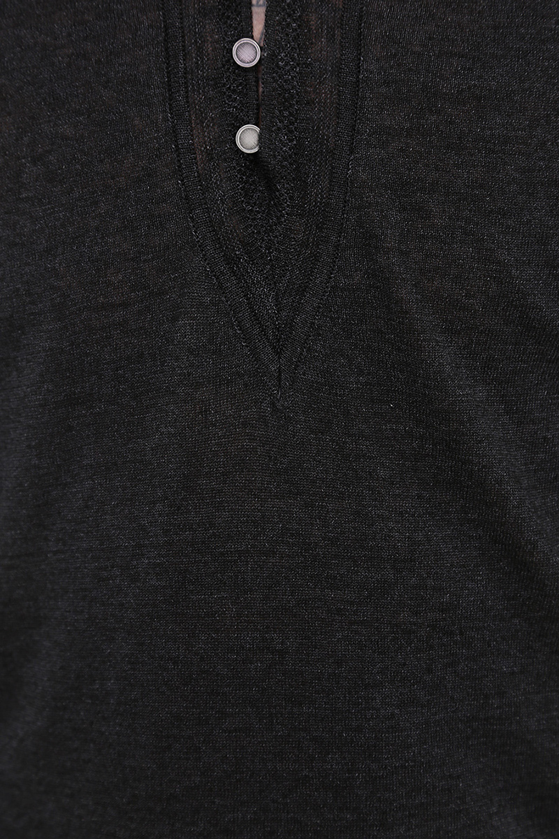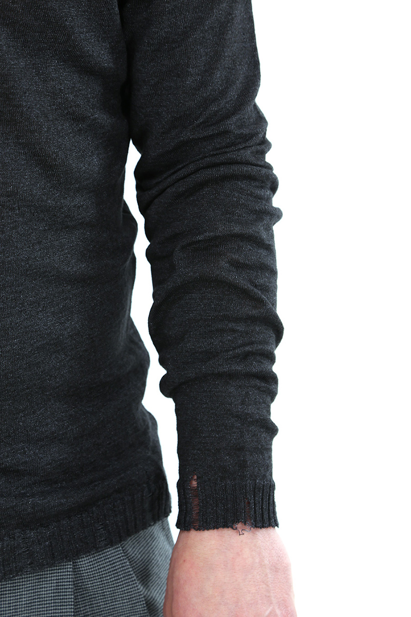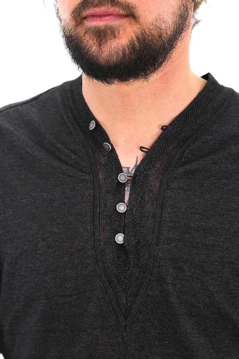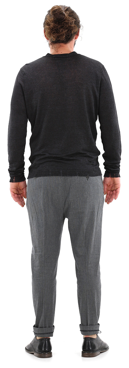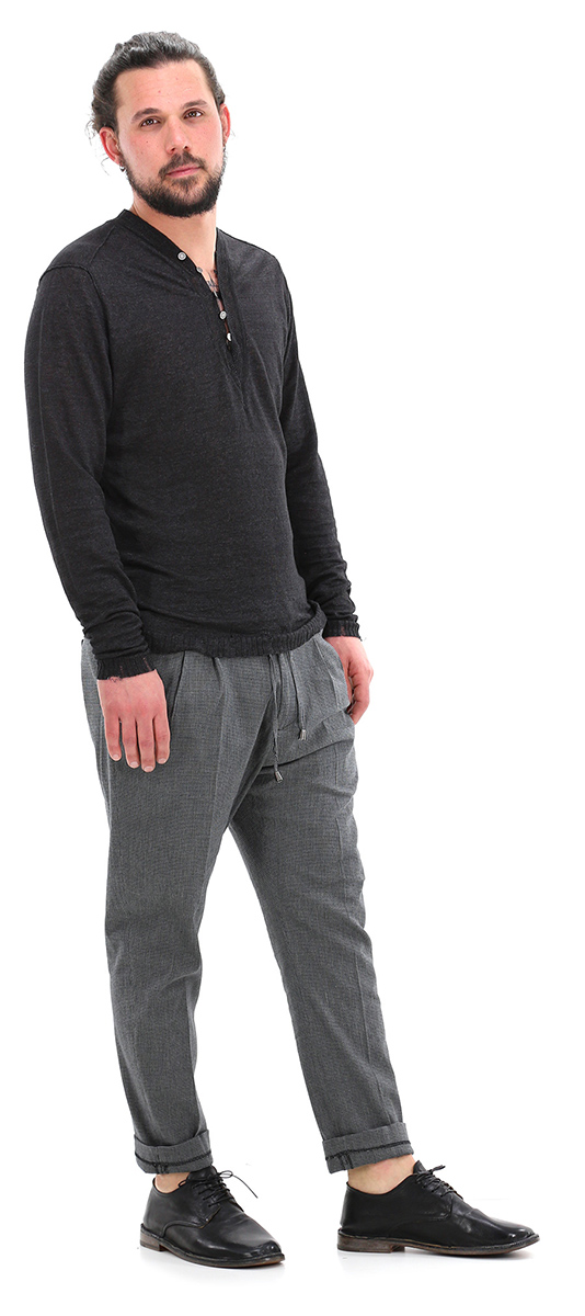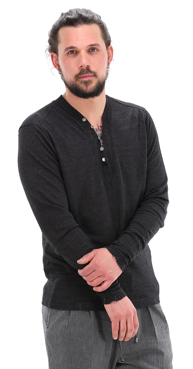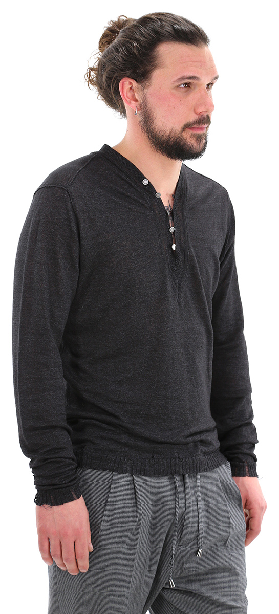 Messagerie sweater in pure linen with long sleeves and collar with button closure. The model is 1.80 cm tall and wears size 48.