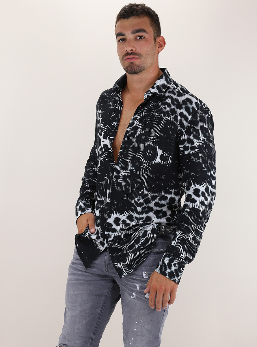 Benevierre shirt in viscose with long sleeves and classic collar. Regular fit. Printed fantasy. The model is 1.80 tall and wears size M.