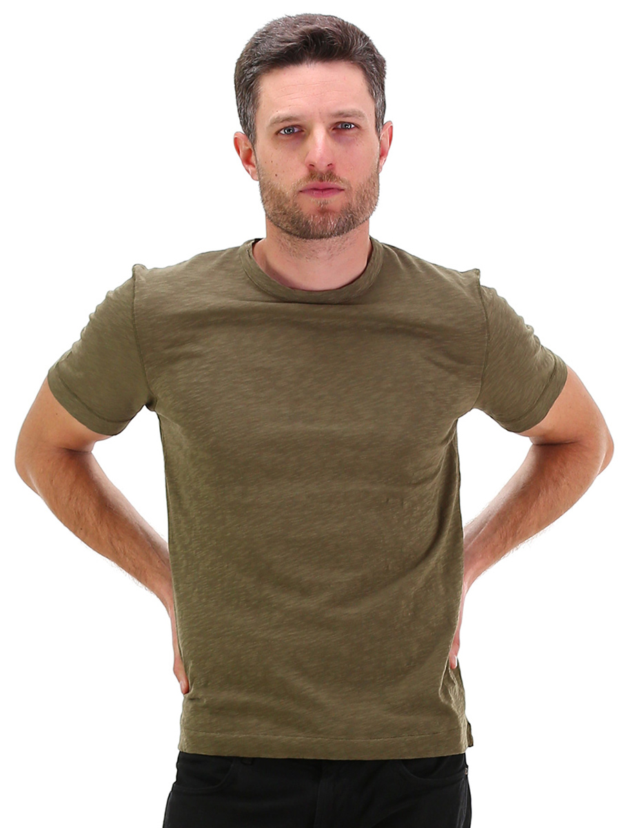Maglia in cotone, manica corta, collo a giro ad effetto saffiano. Il modello è alto 1,82 e indossa la taglia S.