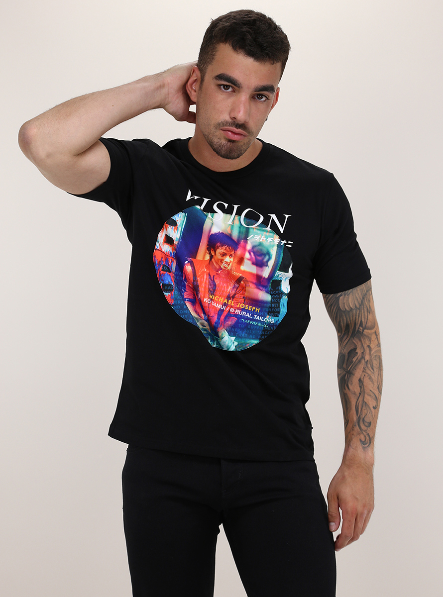 KO Samui cotton t-shirt with short sleeves and round neck. Front Michael Jackson patchwork print. The model is 1.75 tall and wears size M.