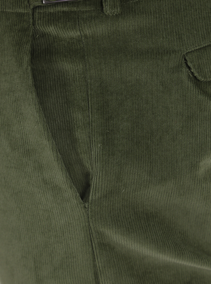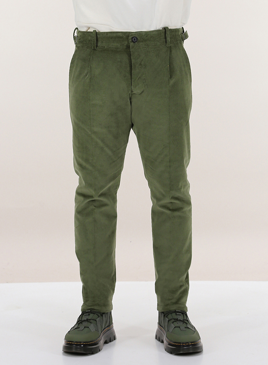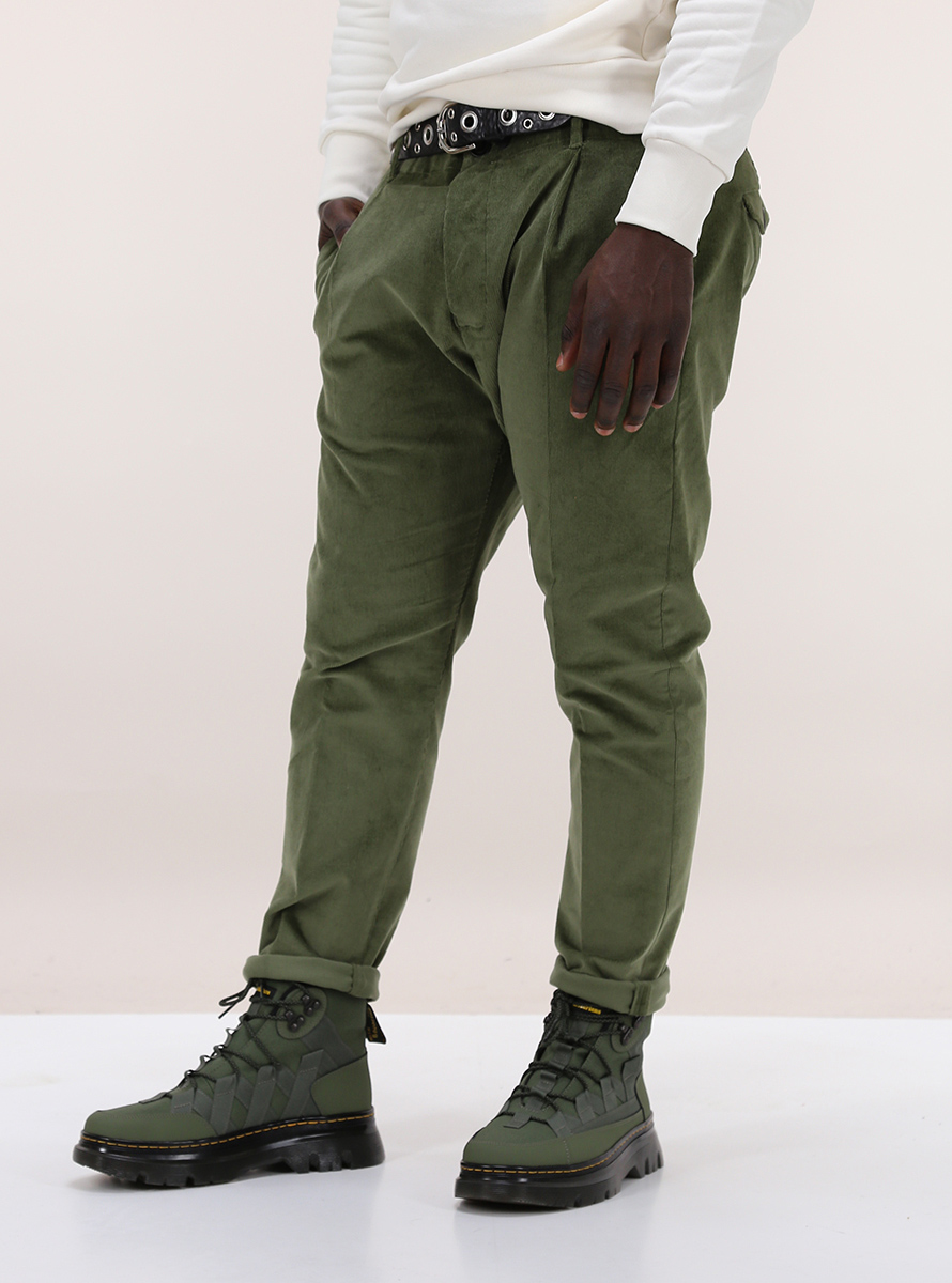 Messaggerie trousers in stretch cotton velvet baggy fit. Front pleats and martingale at the waist. Side slash pockets and back welt pockets. Flounce at the bottom. The model is 1.80 tall and wears size 52.