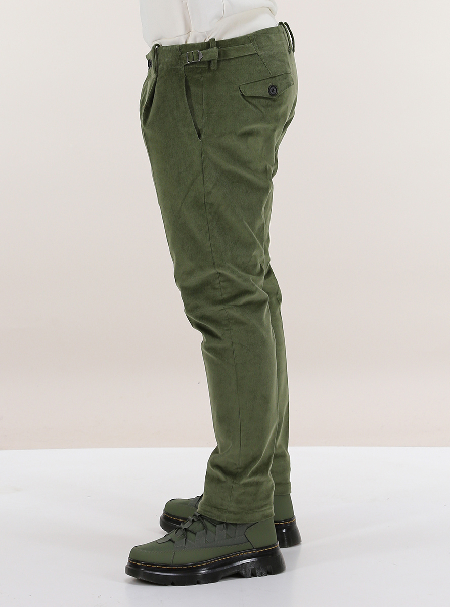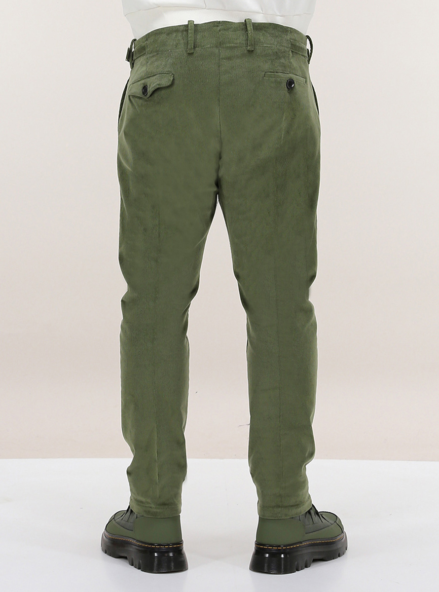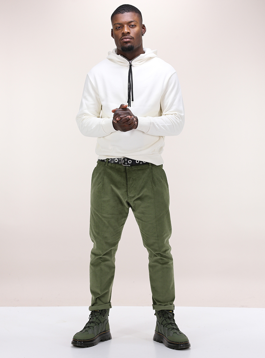 Messaggerie trousers in stretch cotton velvet baggy fit. Front pleats and martingale at the waist. Side slash pockets and back welt pockets. Flounce at the bottom. The model is 1.80 tall and wears size 52.