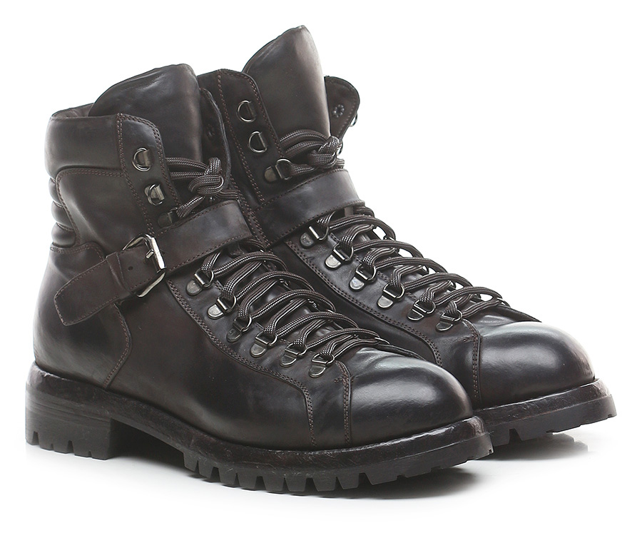 Vintage effect leather ankle boot with side zip and adjustable front strap. Vibram rubber sole. 40mm heel height, 20mm platform with 20mm ledge.