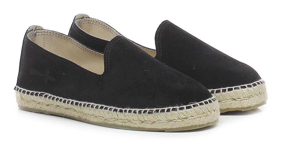 Laceless espadrille style in suede, rubber sole. Heel 25, platform 25. Sole covered in jute. Small fit.