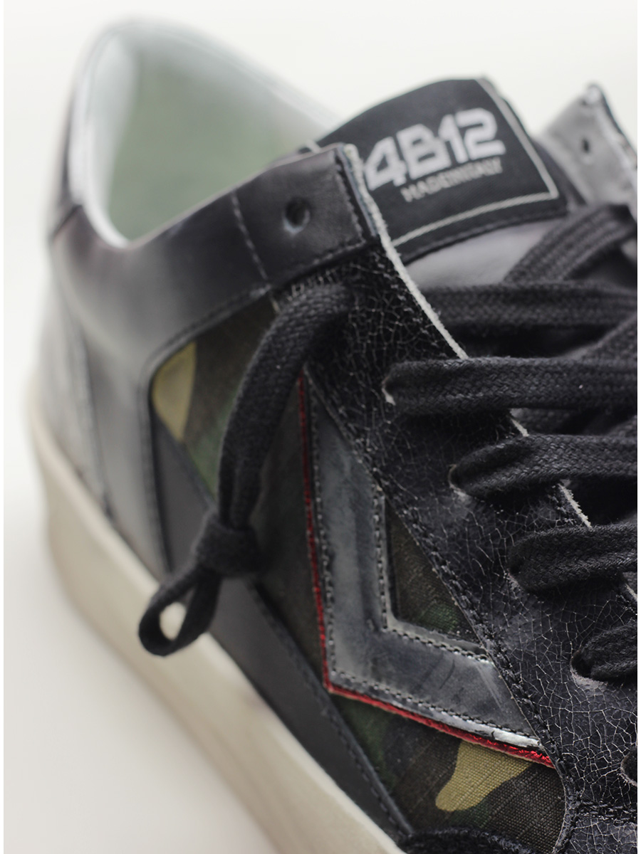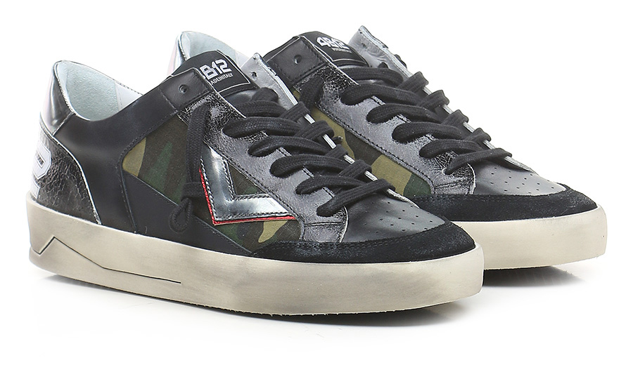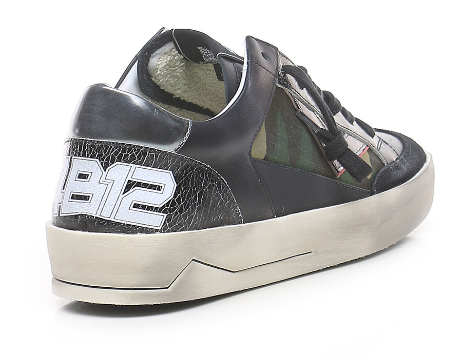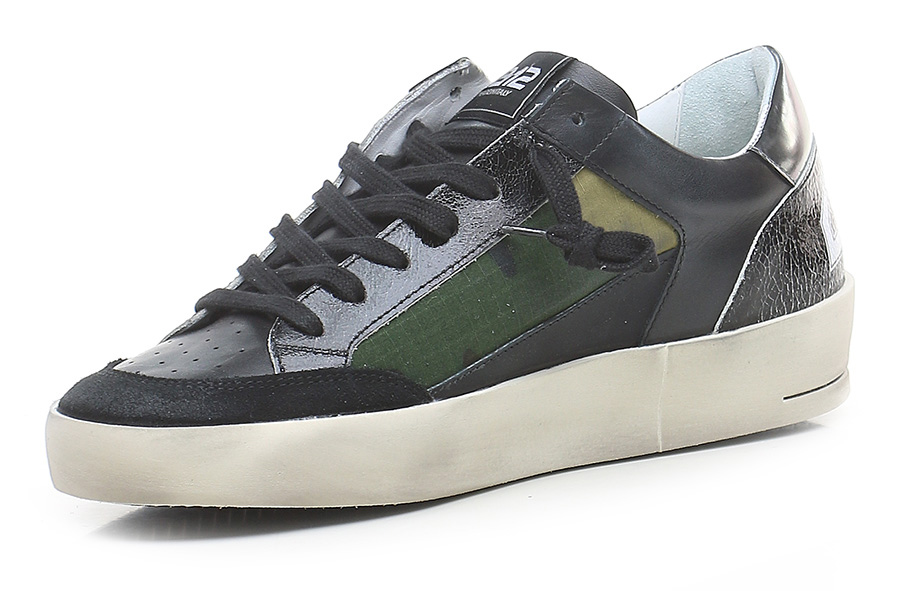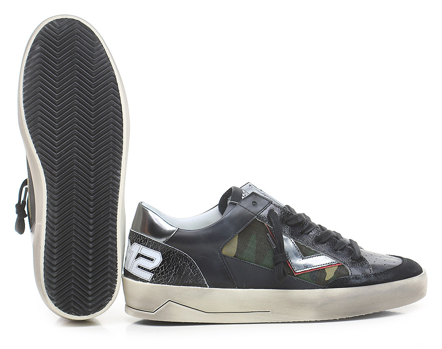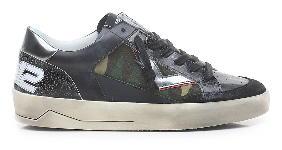 Leather, fabric and crack-effect leather sneaker with vintage-effect suede insert and mirrored leather heel. Vintage effect rubber sole. 35mm heel height, 30mm platform with 5mm ledge.
