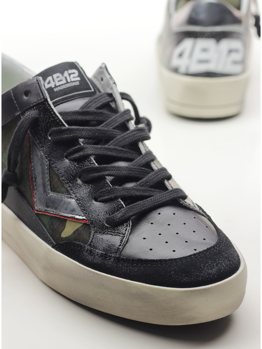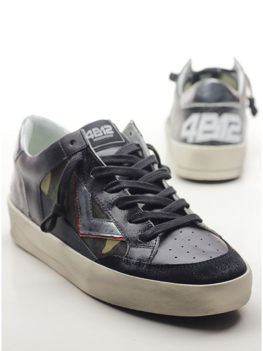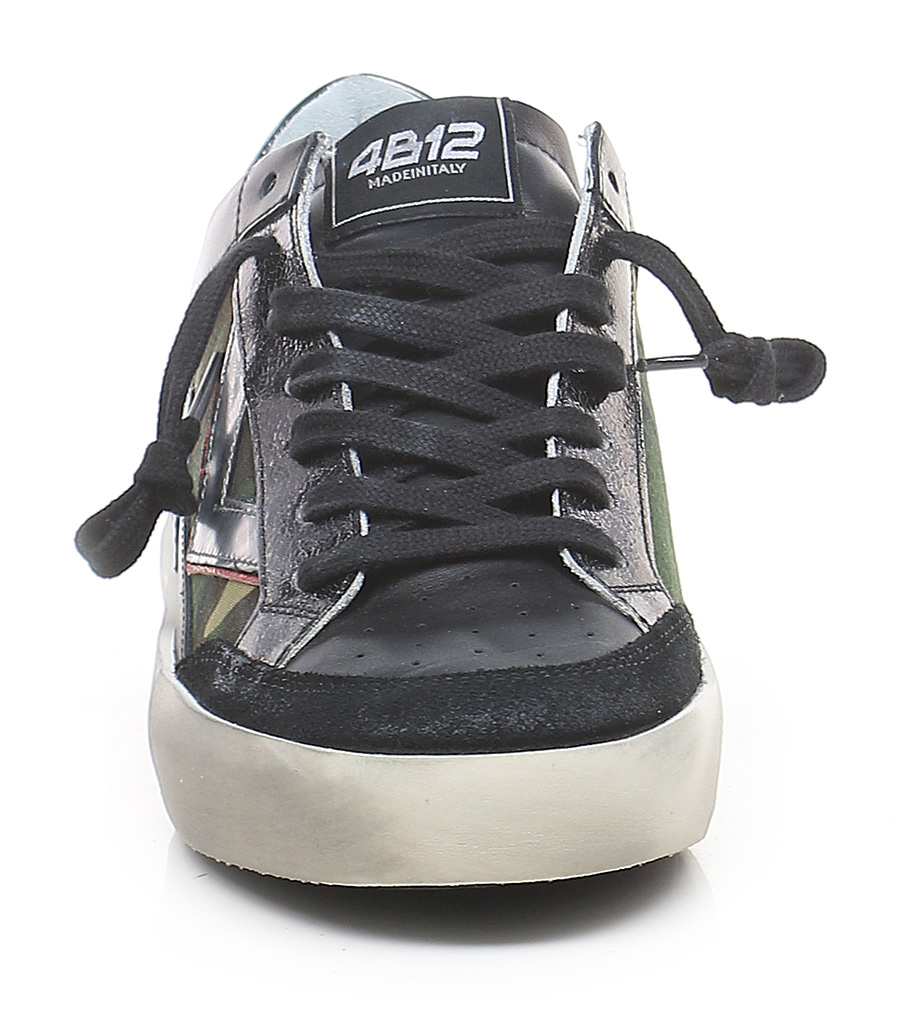 Leather, fabric and crack-effect leather sneaker with vintage-effect suede insert and mirrored leather heel. Vintage effect rubber sole. 35mm heel height, 30mm platform with 5mm ledge.