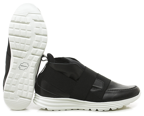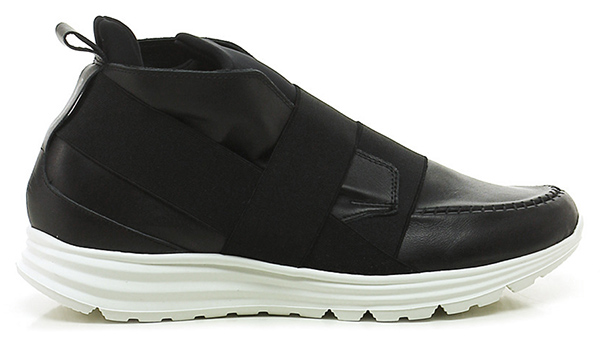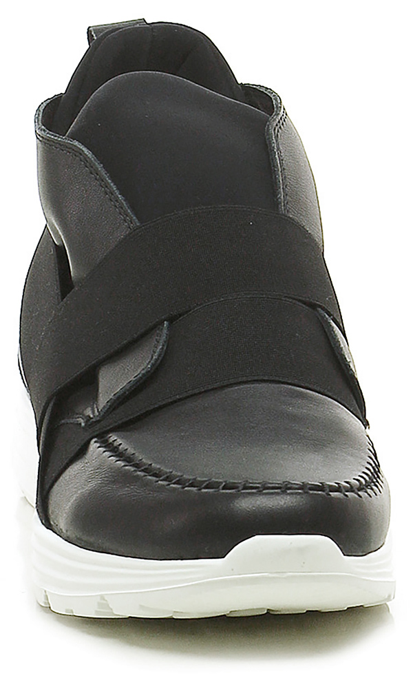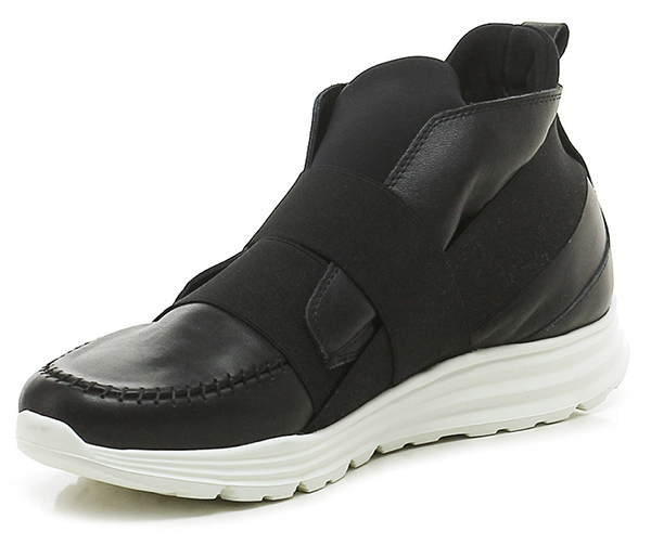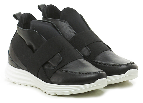 Leather and fabric and stretch sneaker with front and back elastic band. Rubber sole, 40 heel, 20 platform with 20 ledge.