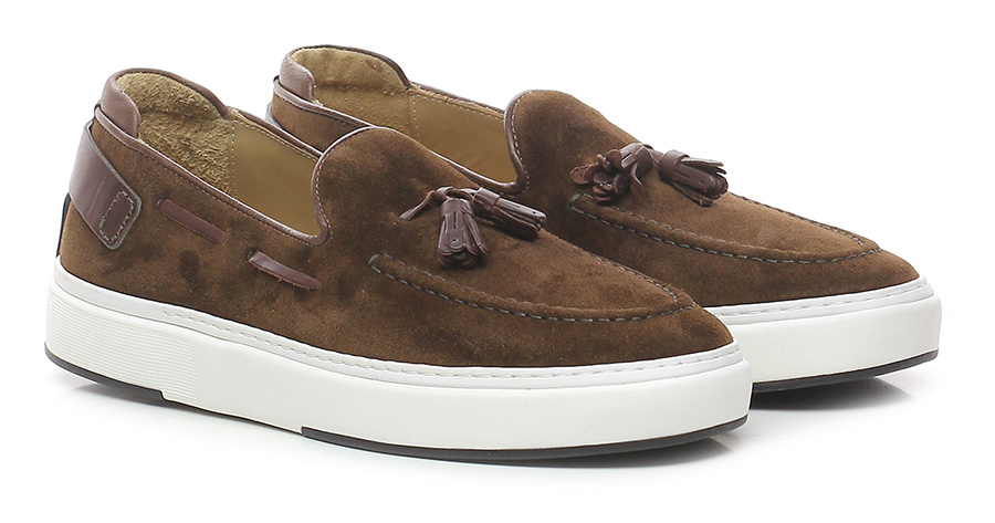 Sneaker in camoscio e pelle, suola in gomma light. Altezza suola: 35, platform 30 con battuta 5. Decorata con nappine