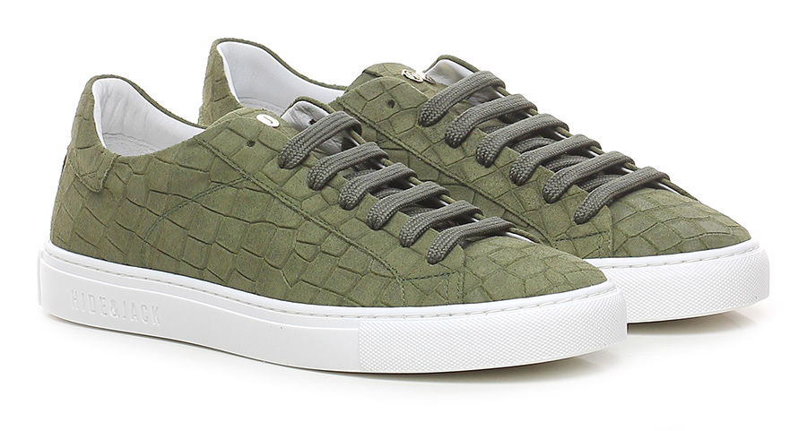 Sneaker in crocodile print suede with TR rubber sole. Sole height: 30, platform 25 with ledge 5. Golden HIDE & JACK logo on the tongue, handmade in Italy.