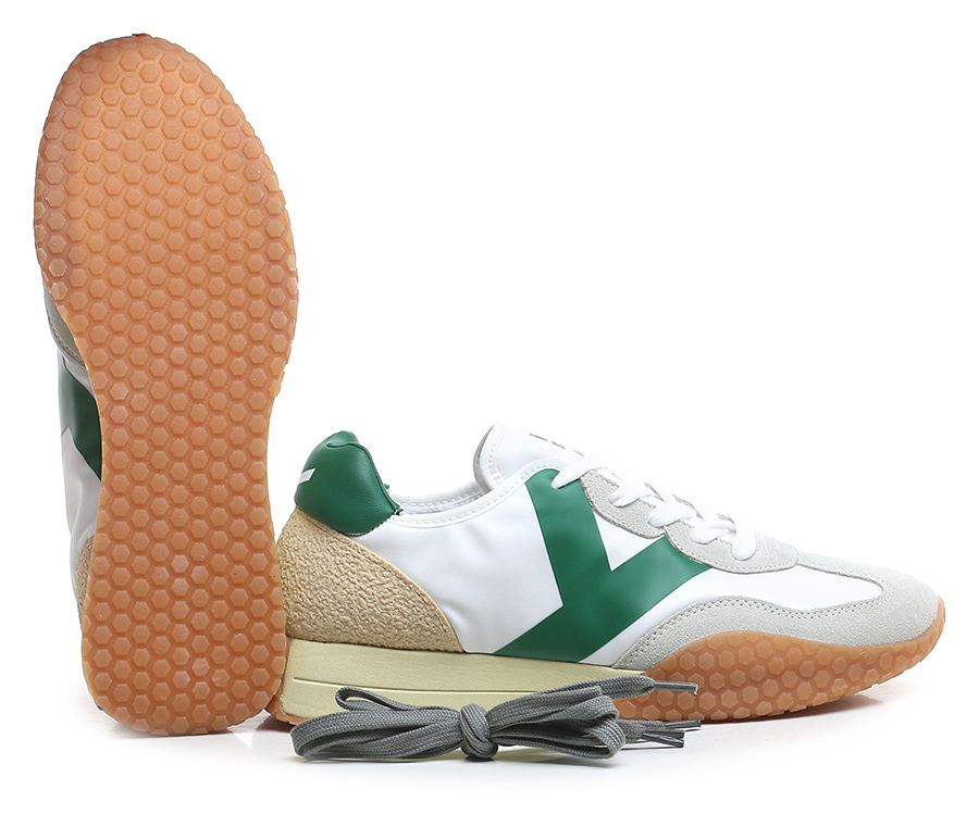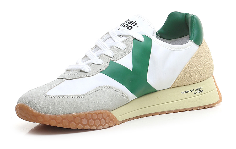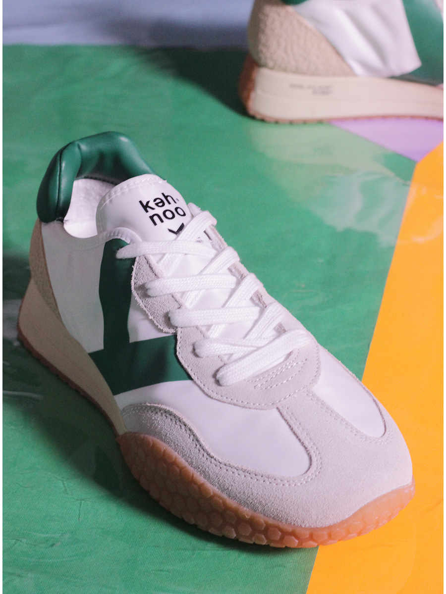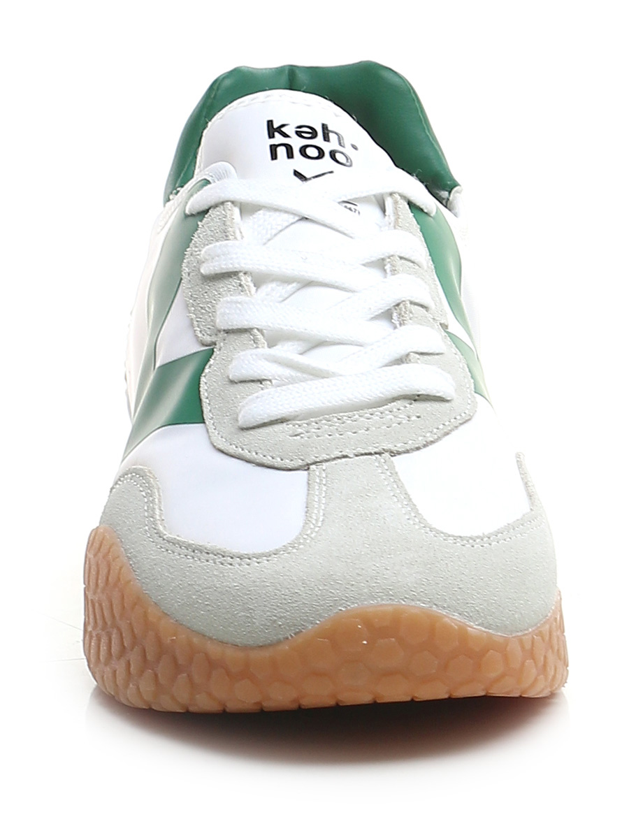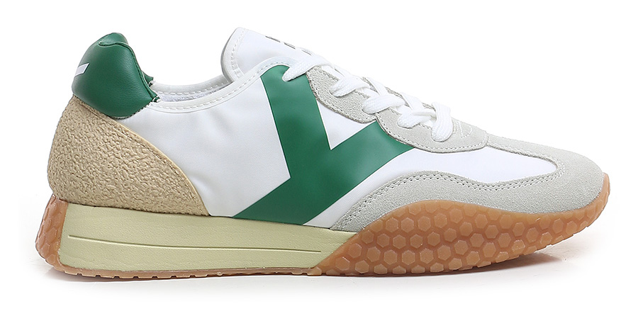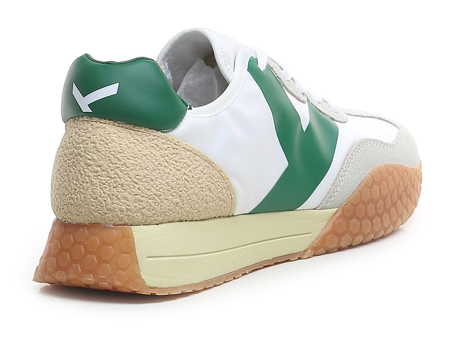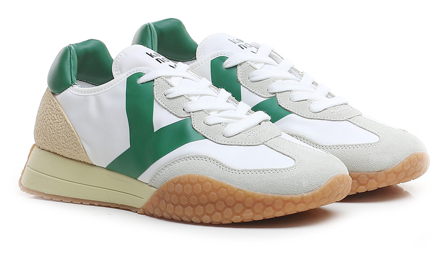 Sneaker in fabric and suede with leather heel tab and pvc insert on the back. Rubber sole. Heel height 30mm, platform 20mm with 10mm ledge.