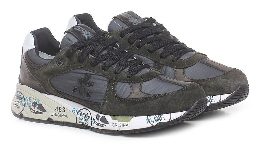 Sneaker in camoscio, pelle e tessuto con suola in gomma. Altezza suola 45, platform 25 con battuta 20.