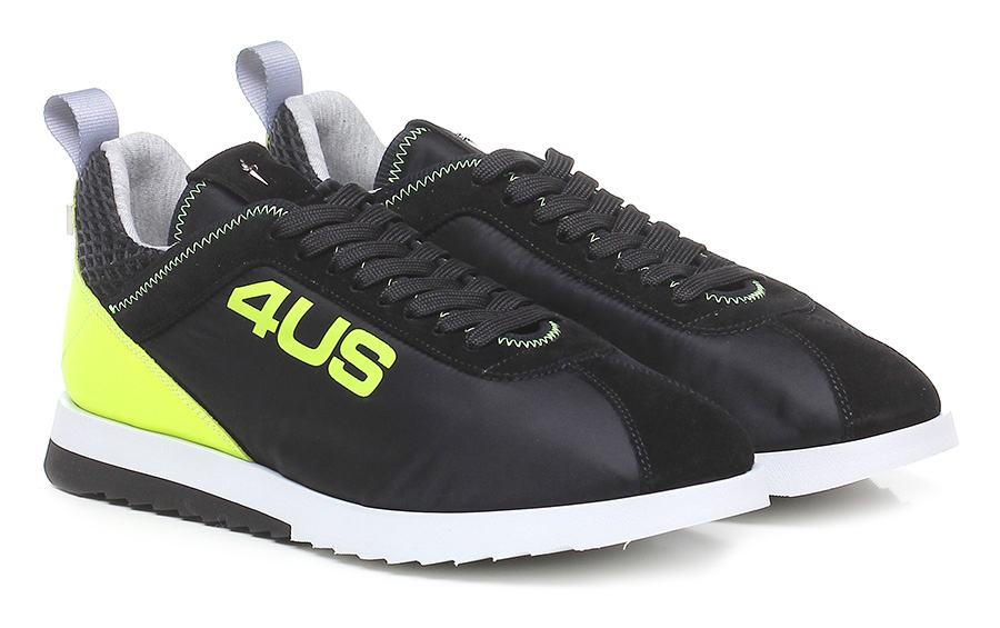 Sneaker in camoscio, tessuto e pelle effetto gommato, suola in gomma. Tacco 30, platform 15 con battuta 15.