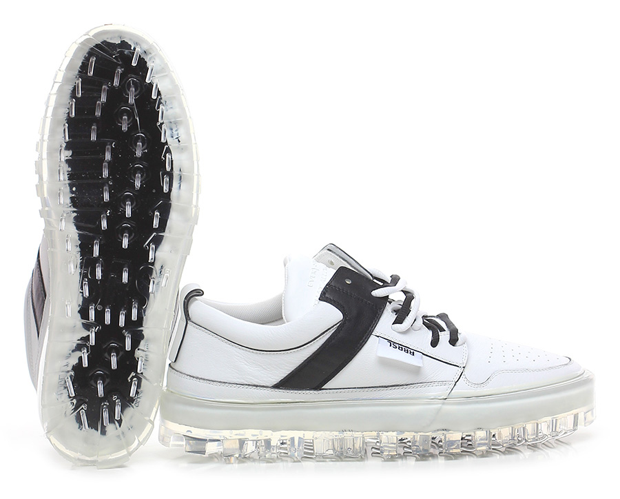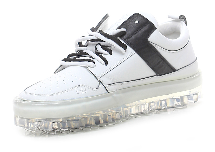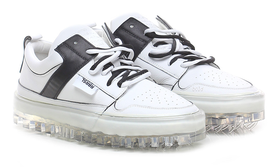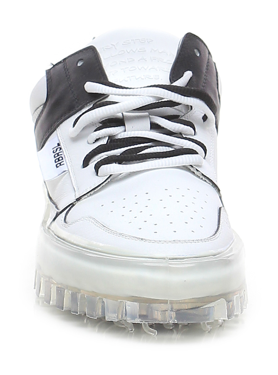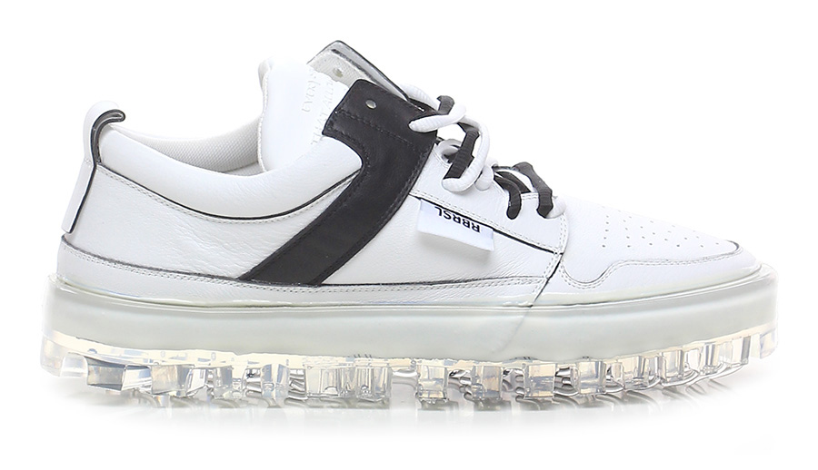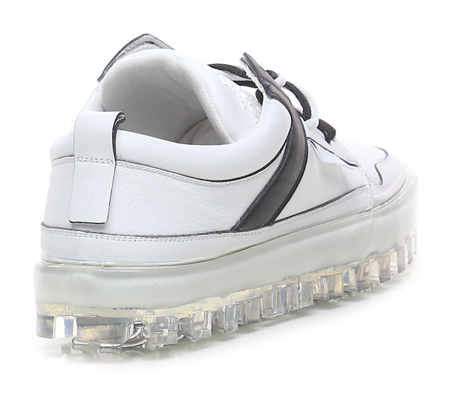Leather sneaker with rubber inserts and tongue with embossed payoff, lug sole created using transparent liquid material in a patented mold that is stimulated at high temperature. Sole height: 35, platform 30, platform 5.