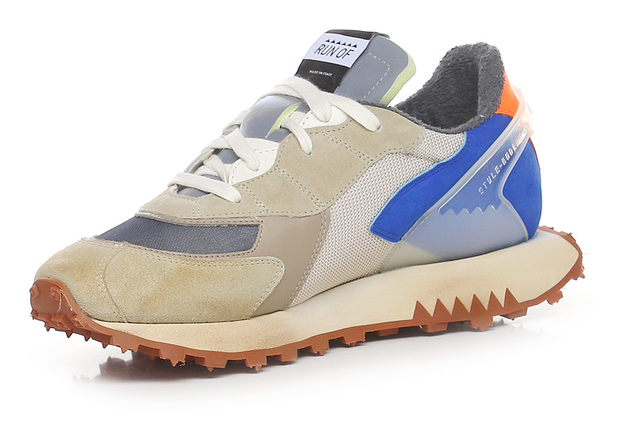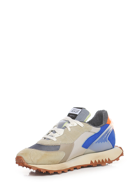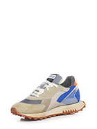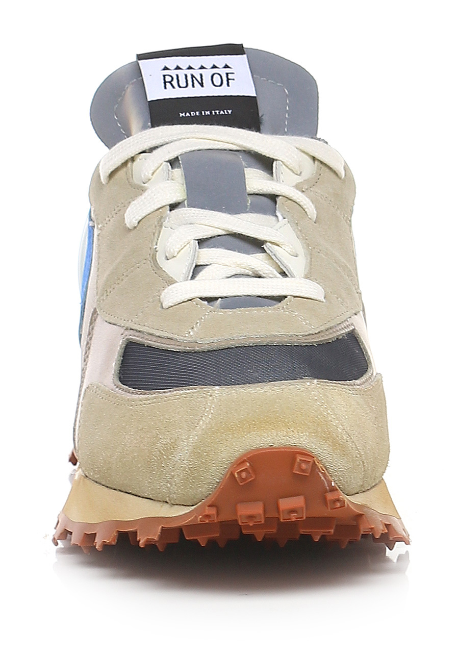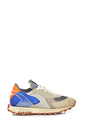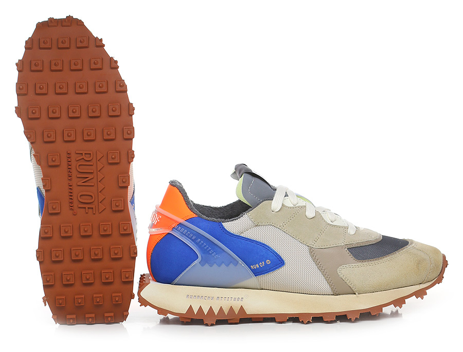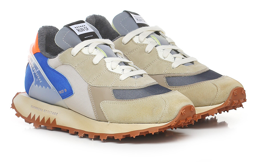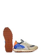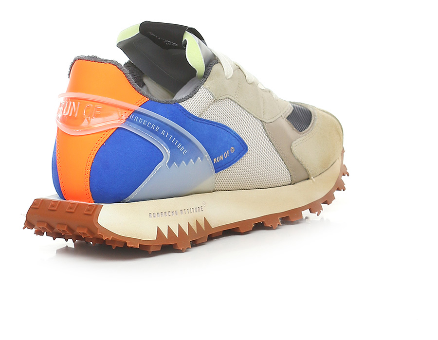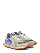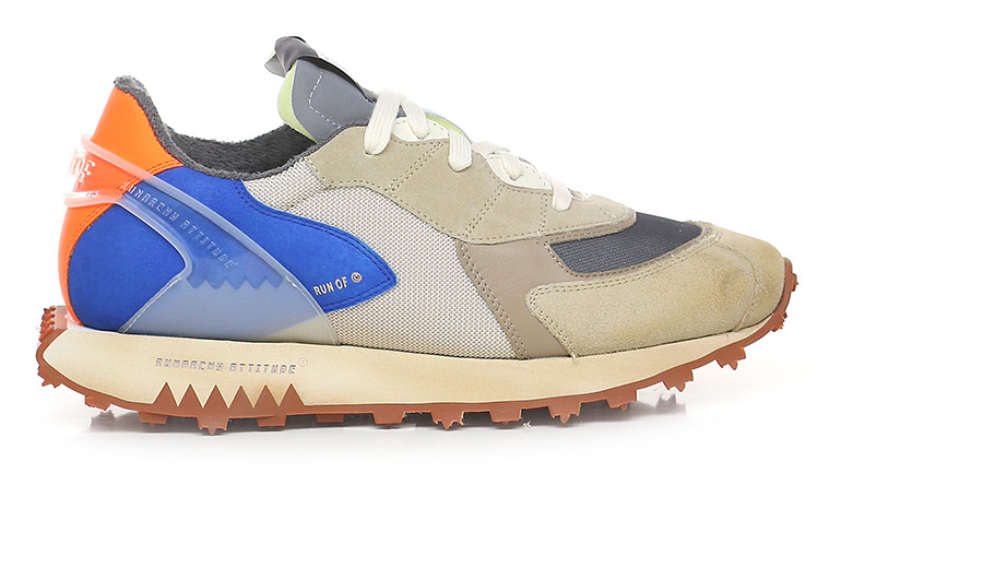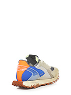 Sneaker in fabric, suede, nubuck and leather inserts with PVC insert. Oversized rubber sole. Heel height 30mm, platform 20mm with 10mm ledge.