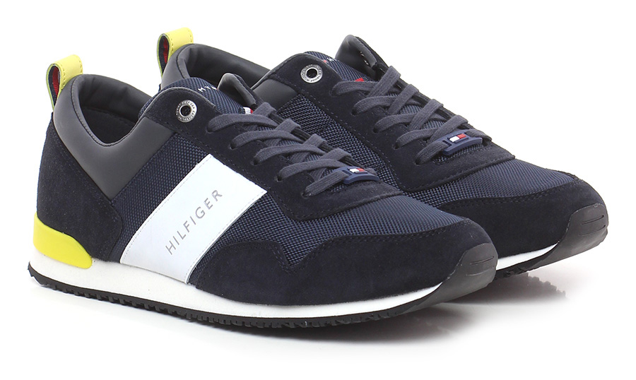 Sneaker in camoscio, tessuto e pelle, suola in gomma. Tacco 30, platform 15 con battuta 15.