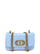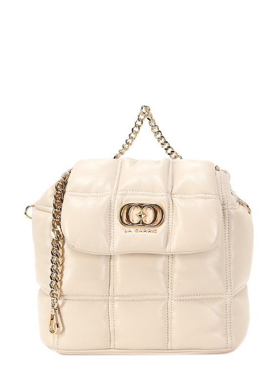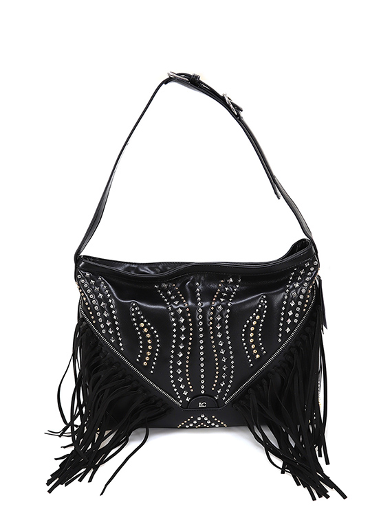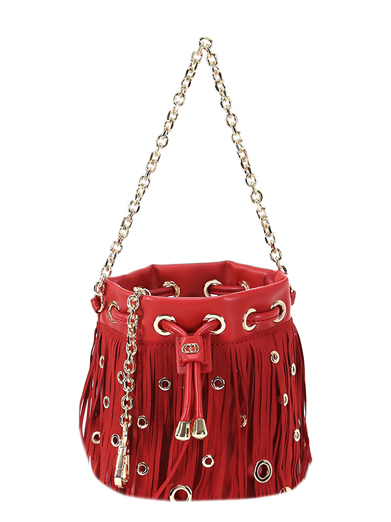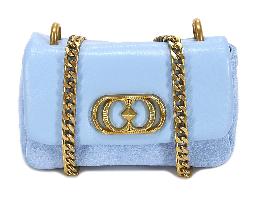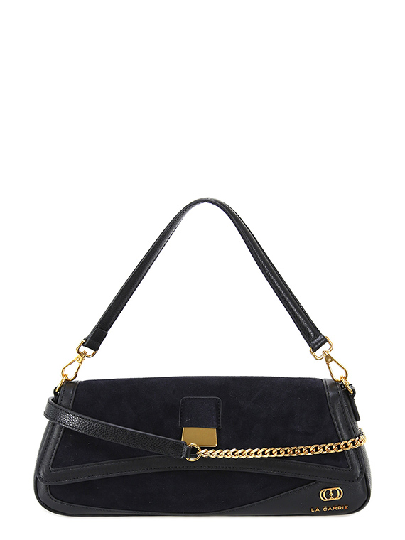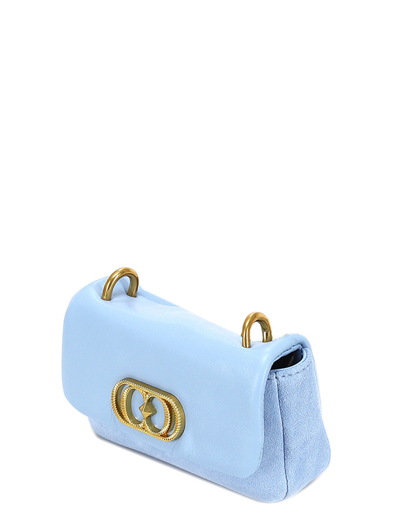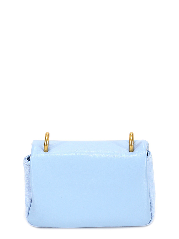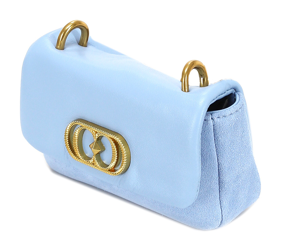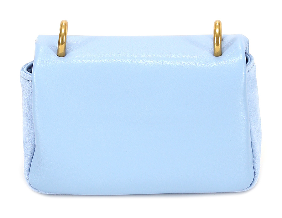 Suede bag with magnetic button closure. Shoulder strap included. Measures 17 x 12cm.