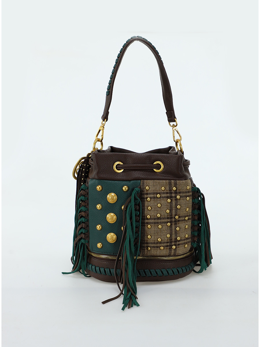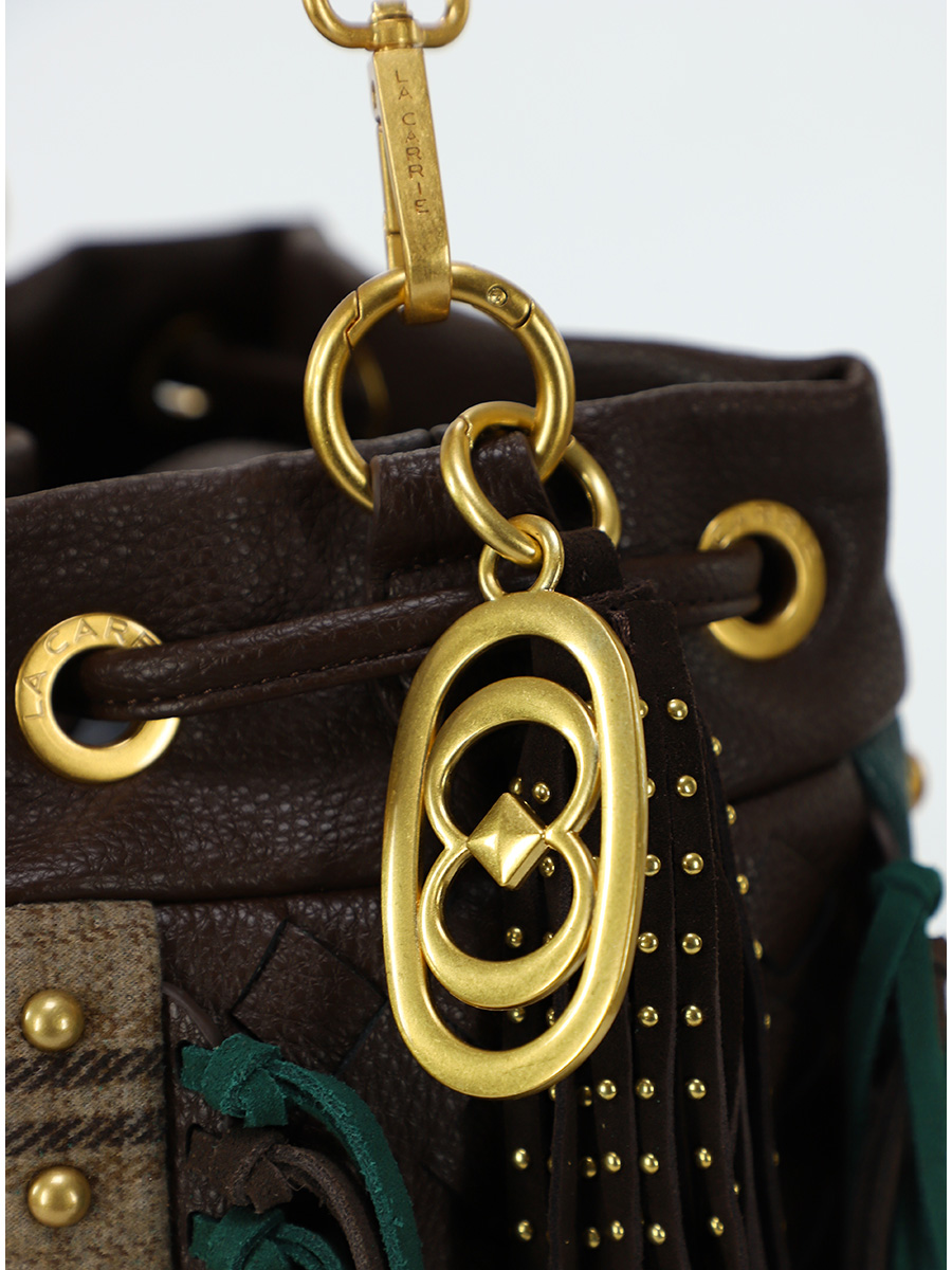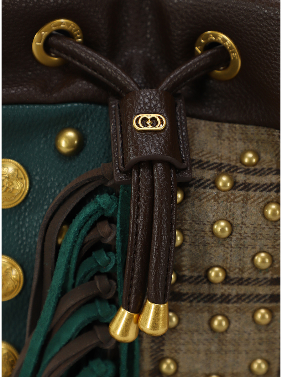 : Logo, Studs, Bottom with studs, Gold details, Fringe, Tassels, Pattern