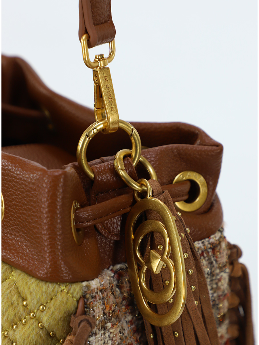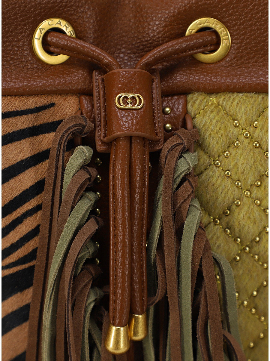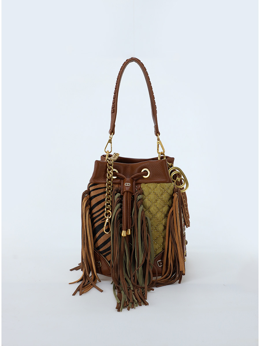 : Logo, Studs, Bottom with studs, Gold details, Fringe, Tassels, Pattern