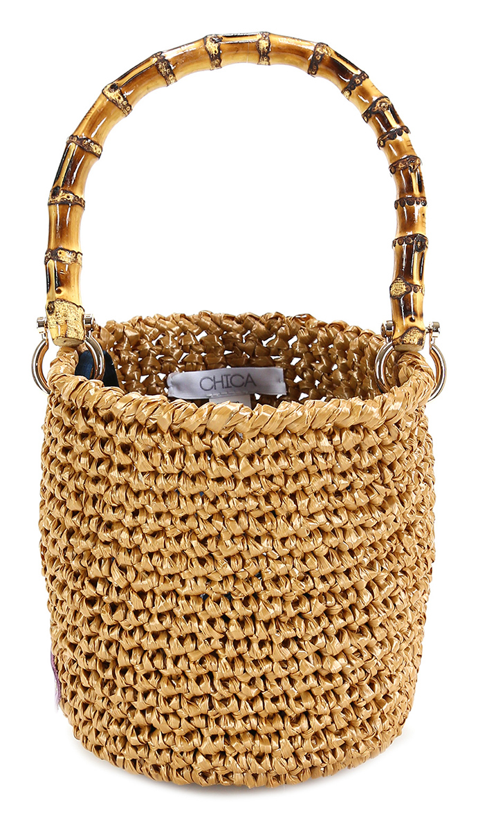 Raffia bag with bucket closure. Measures 26 x 18cm.