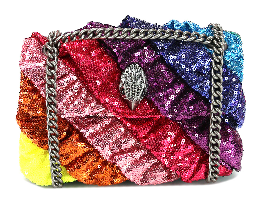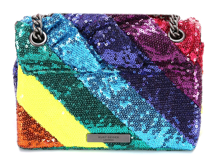 Fabric bag with applied sequins and magnetic closure buttons. Metal shoulder strap included. Measures 22 x 14cm.