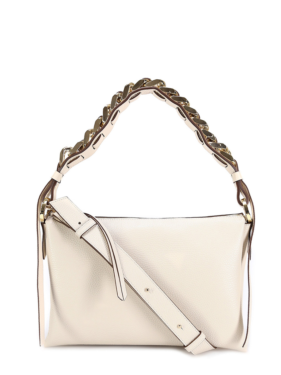 Textured leather bag with zip closure. Shoulder strap included. Measures 33 x 23cm. Gold details.
