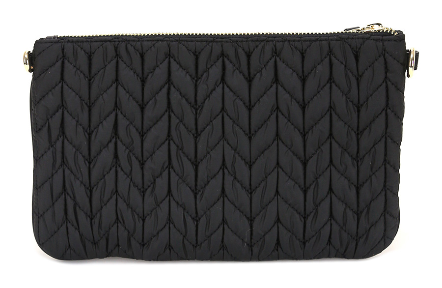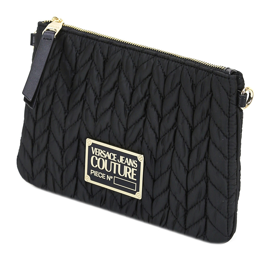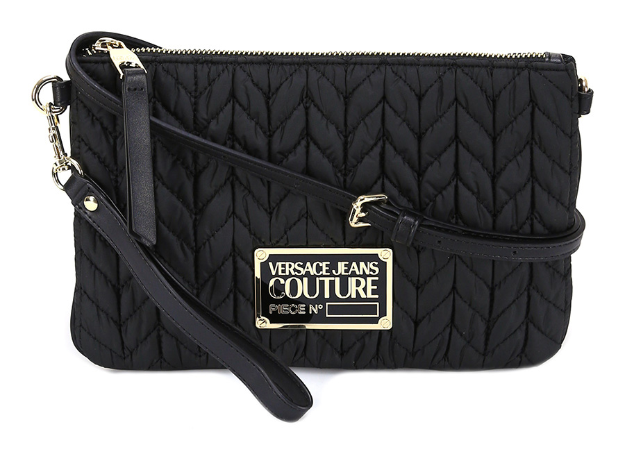 Fabric bag with zip closure. Wristband and shoulder strap included. Measures 26 x 18cm.