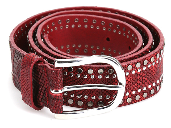 Cintura in pelle con borchie e fibbia metallica, altezza 3,5 cm.