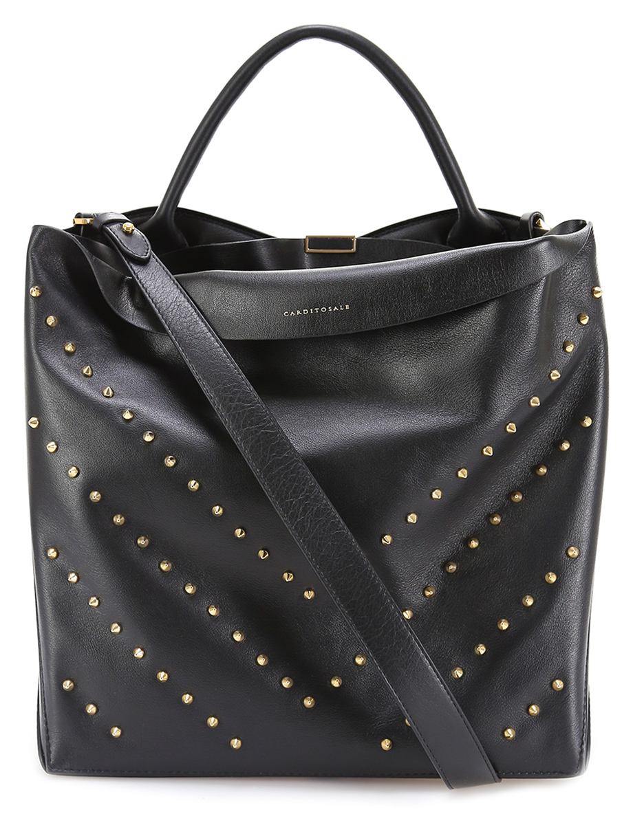 Borsa in pelle effetto martellato con chiusura ad incastro e borchie frontali. Tracolla e pochette interna inclusa. Misure 30 x 30 cm. Dettagli gold.