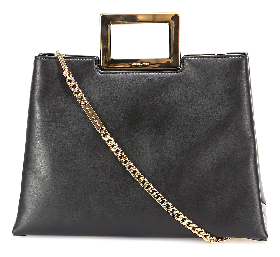 Borsa in pelle con chiusura a bottone. Tracolla inclusa. Misure 29 x 32 cm. Dettagli gold
