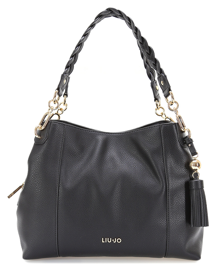 Borsa in eco pelle con chiusura a bottone magnetico. Manici in eco pelle intrecciata e decorazioni silver. Al suo interno presenta tre scomparti , due aperti ed uno chiuso con cerniera. Misure 35 x 26 cm.