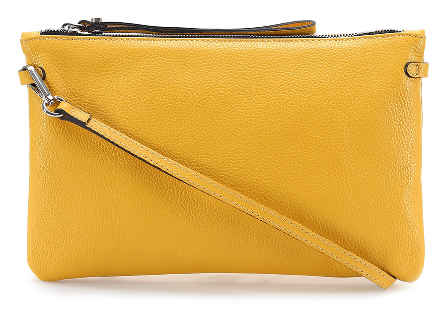 Pochette in pelle effetto martellato con chiusura a zip. Tracolla inclusa. Misure 20 x 29 cm. Dettagli silver.