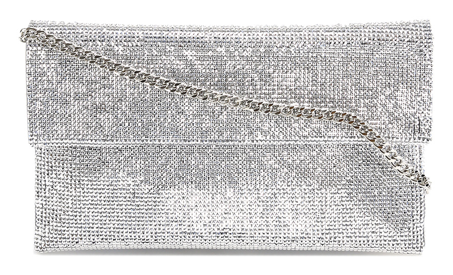 Pochette con chiusura magnetica. Perline applicate. Tracolla in metallo inclusa. Misure 25 x 15 cm. Dettagli silver.