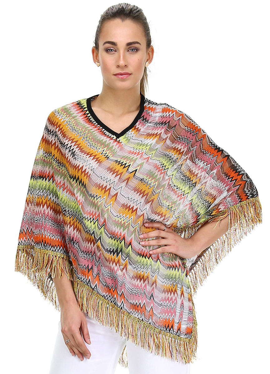Poncho asimmetrico in viscosa con fantasia zig-zag etnica. Collo a V bordato e frange sul fondo.