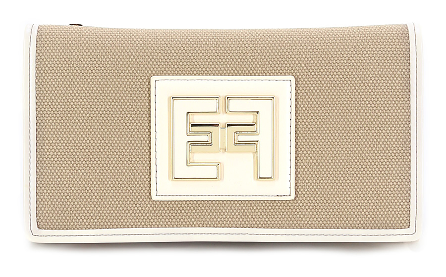 Portafoglio in tessuto e profili in pelle sintetica con bottone di chiusura. Porta tessere, porta banconote e porta monete interni. Misure 22 x 11 cm. Dettagli gold.