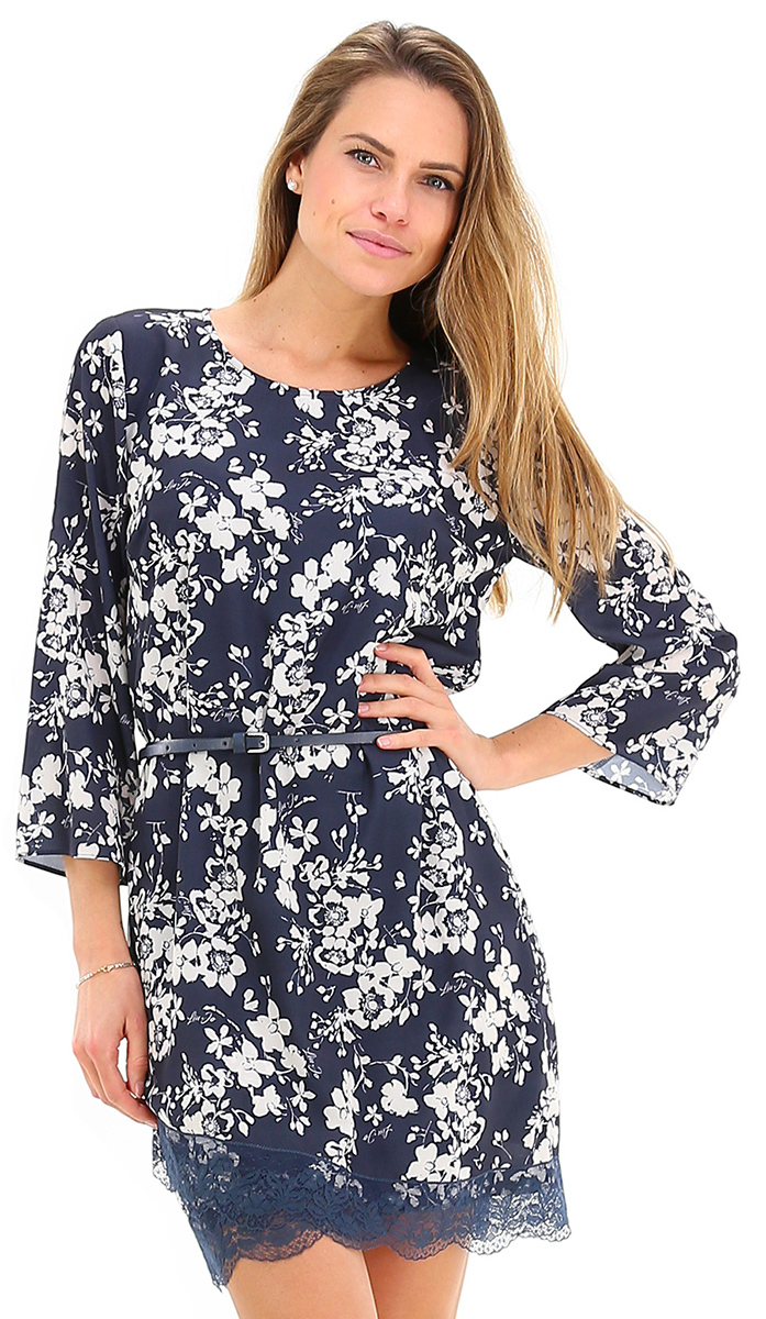 Abito chamisier foderato con maniche a tre quarti e collo a giro. Inserto in pizzo sul fondo e cintura in ecopelle inclusa. La modella è alta 1.68 ed indossa la taglia 40.