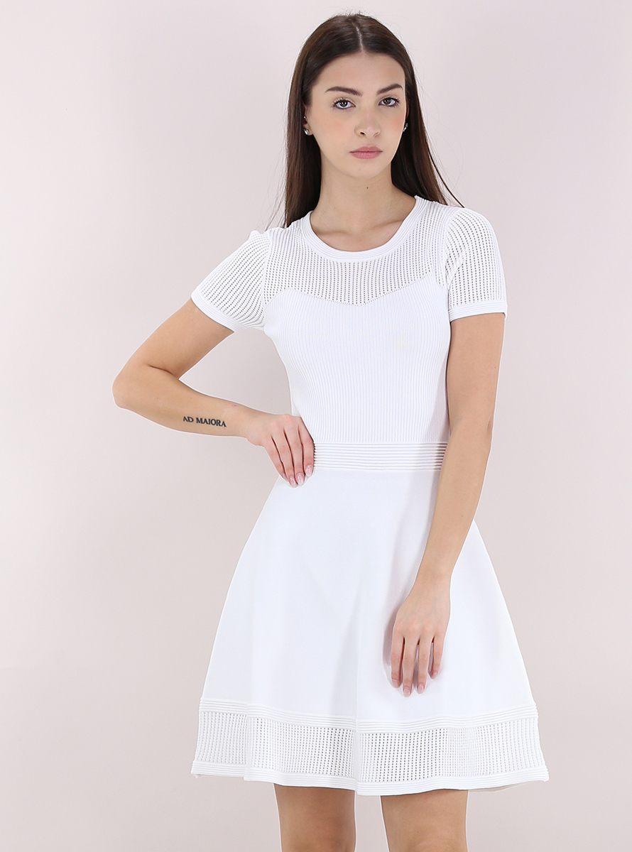 Abito Pinko in misto viscosa stretch. Maniche corte e collo a giro. Fondo svasato e fantasia a rete. La modella è alta 1,70 ed indossa la taglia XS.