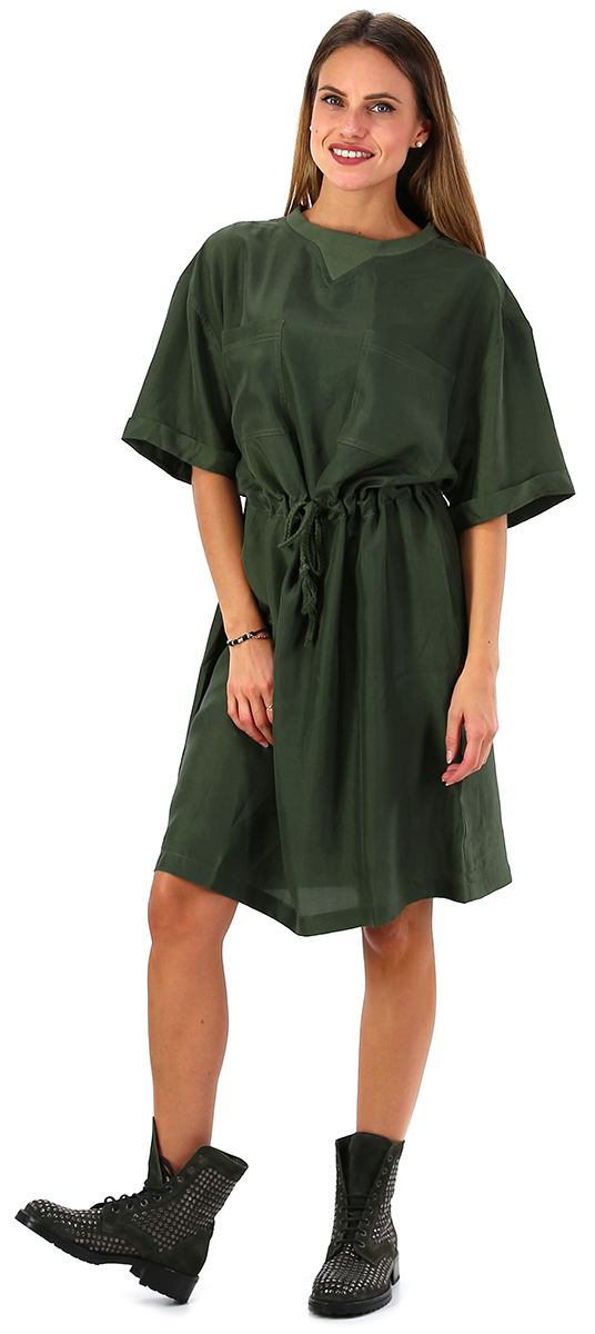 Abito in Seta, coulisse in vita con tasche a toppa frontali, maniche corte e collo a giro. La modella è alta 1,68 ed indossa la taglia 40.