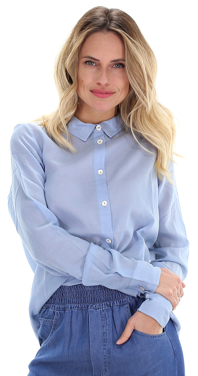 Camicia morbida in cotone e viscosa a maniche lunghe e colo classico. La modella è alta 1.68 ed indossa la taglia 40.