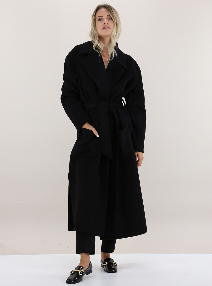 Simona Corsellini dressing gown coat in unlined wool. Long sleeves and reverse collar. Front patch pockets and side slits on the bottom. Fabric belt included. The model is 1.68 tall and wears size 40.