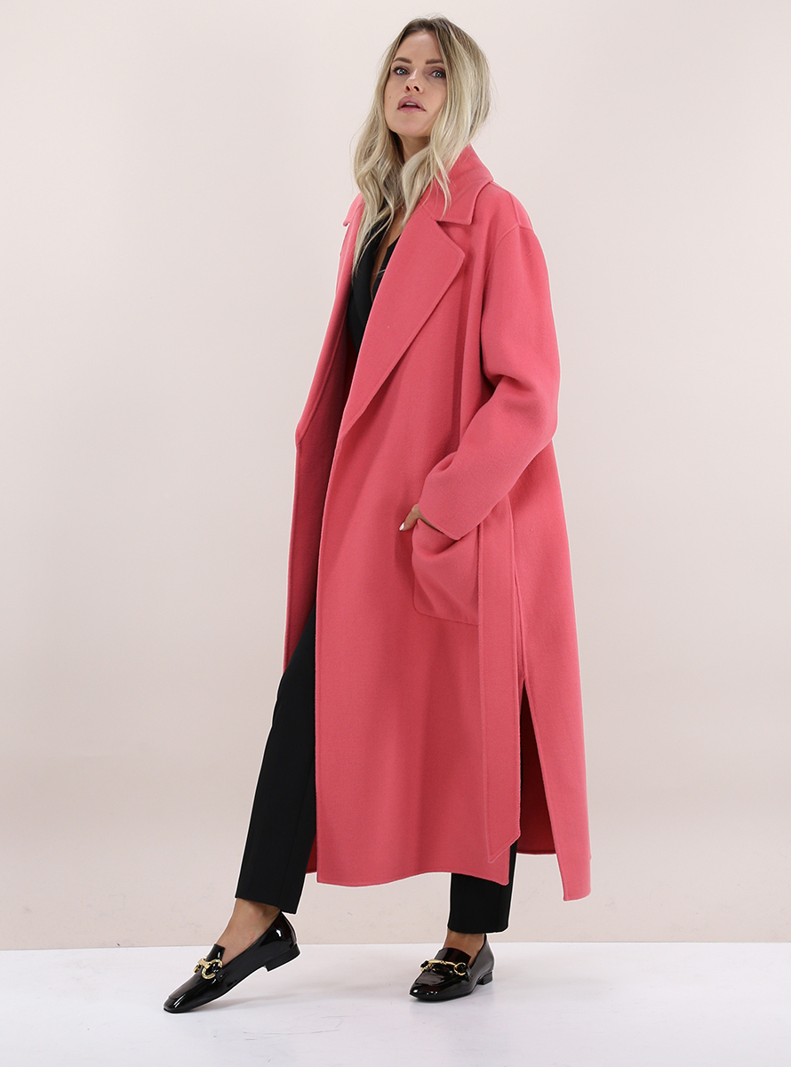 Simona Corsellini dressing gown coat in unlined wool. Long sleeves and reverse collar. Front patch pockets and side slits on the bottom. Fabric belt included. The model is 1.68 tall and wears size 40.