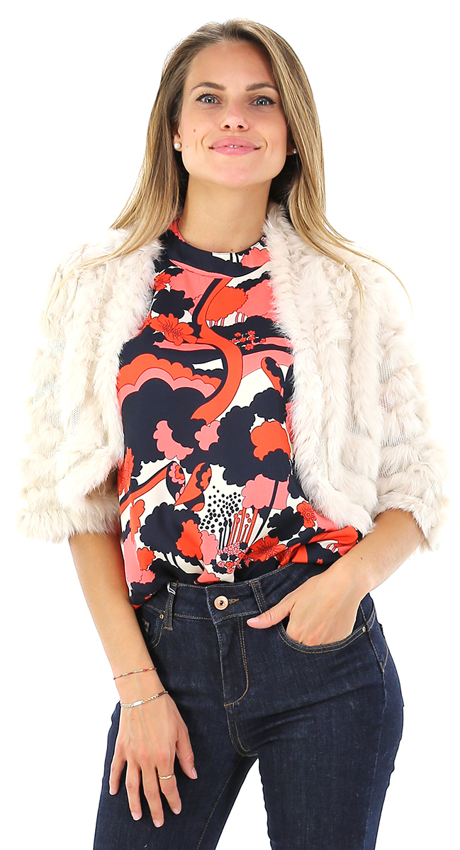 Copri spalle in maglia e Lapen. Maniche a 3\4 e collo montante sul retro. La modella è alta 1,68 ed indossa la taglia XS.