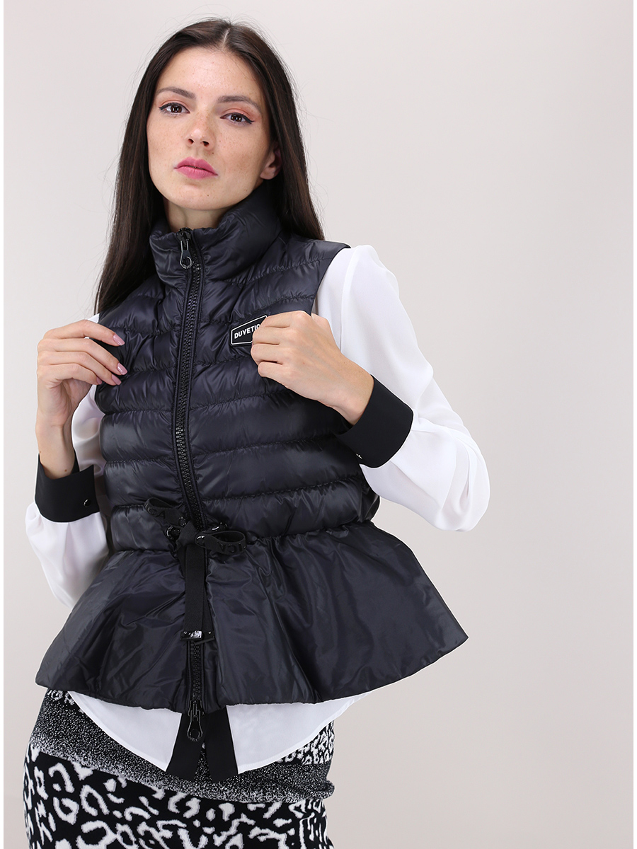 Duvetica sleeveless down jacket in feather. Band collar and ruffle with logoed drawstring at the waist. Front zip closure. The model is 1.80 cm tall and wears size 38.